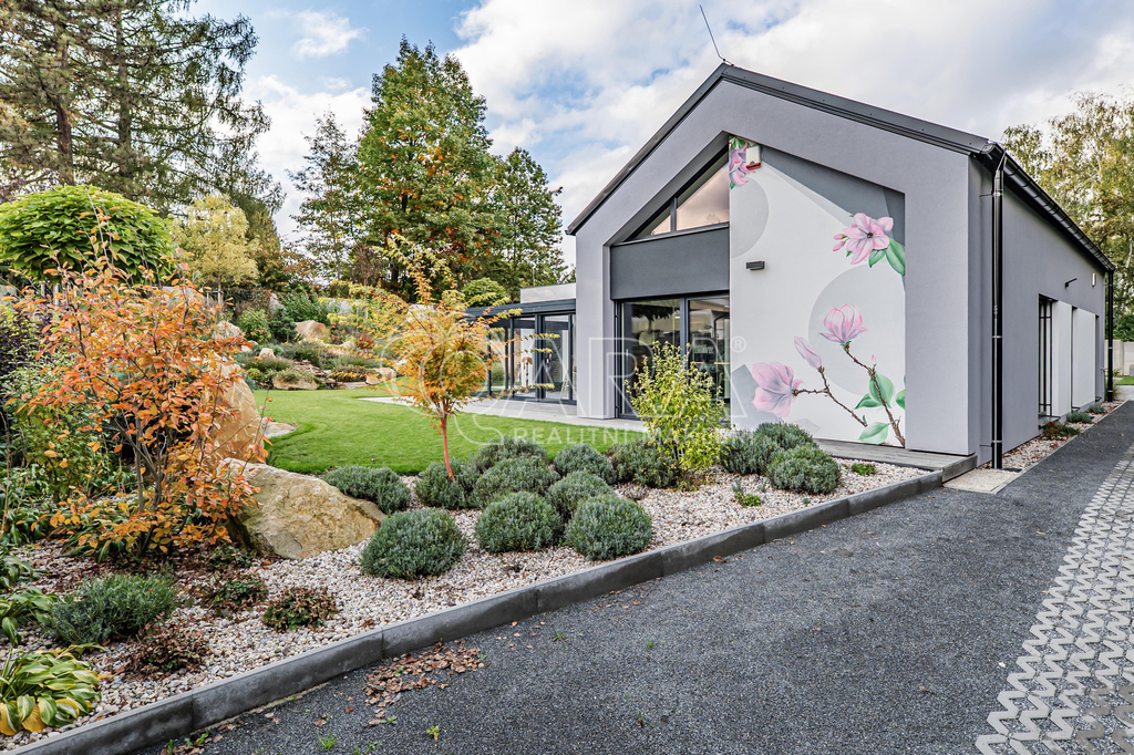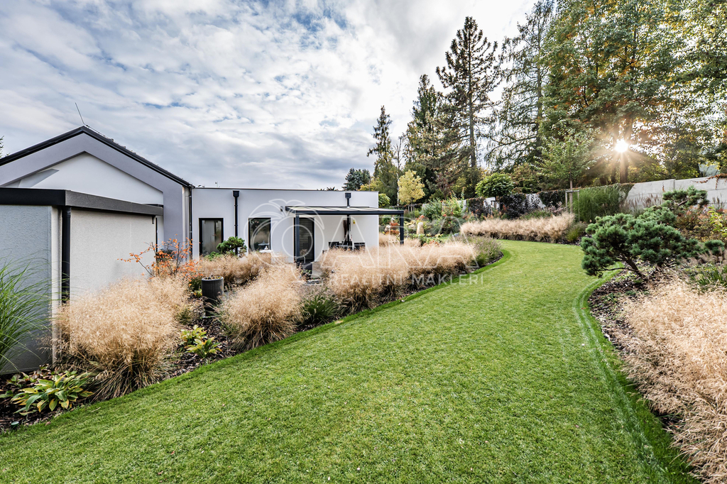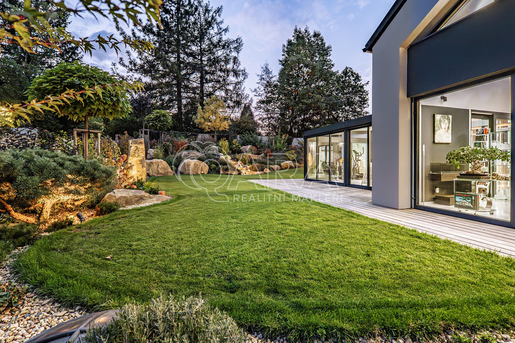 Vodní kaskáda, LED osvětlení, bonsaje a solitérní stromy, terasy, automatická závlaha, profesionální modelace terénu a výsadba zajišťující absolutní soukromí. Celek působí jako soukromý resort.