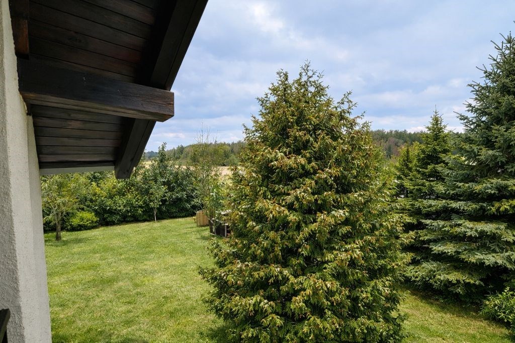 Zahrada je převážně rovinatá, po okrajích osázená okrasnými dřevinami a keři, celá oplocená, po zahradě je udělána automatická závlaha. V rohu zahrady je dřevěný zahradní domek, který je napojen na vodu a elektřinu. Vjezd je opatřen vraty na dálkové ovládání a parkovací plocha velmi prostorná, ze zámkové dlažby, cca pro 4 auta. V zadní části zahrady je také branka se vstupem do vedlejší ulice pod lesem.