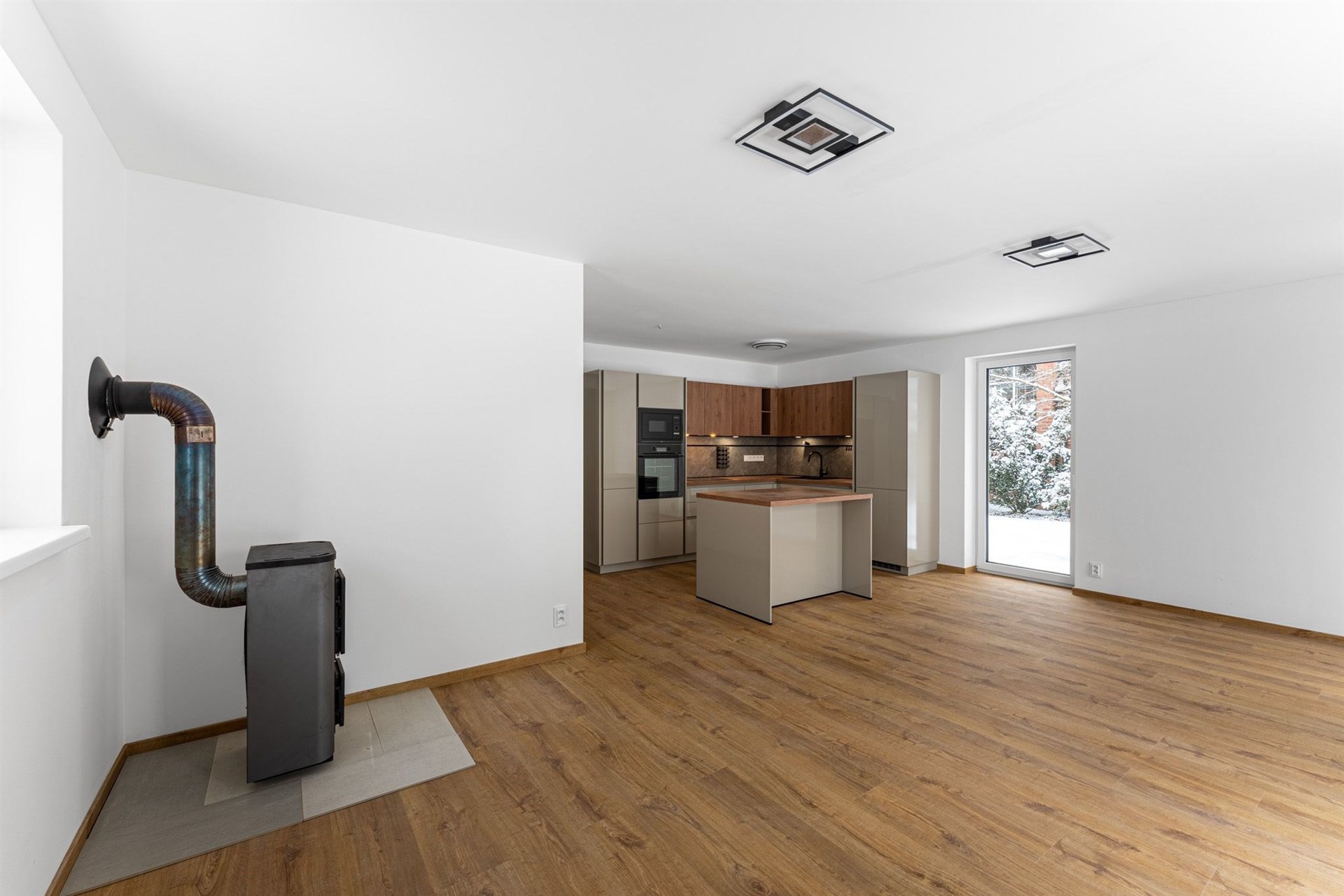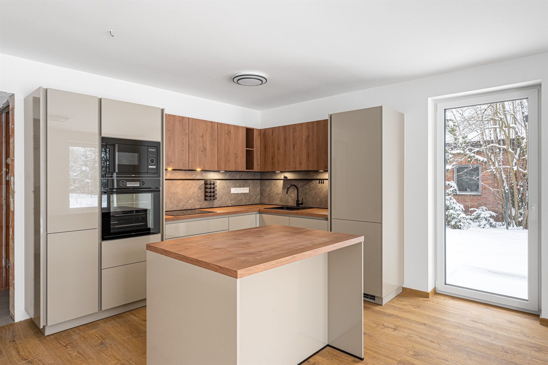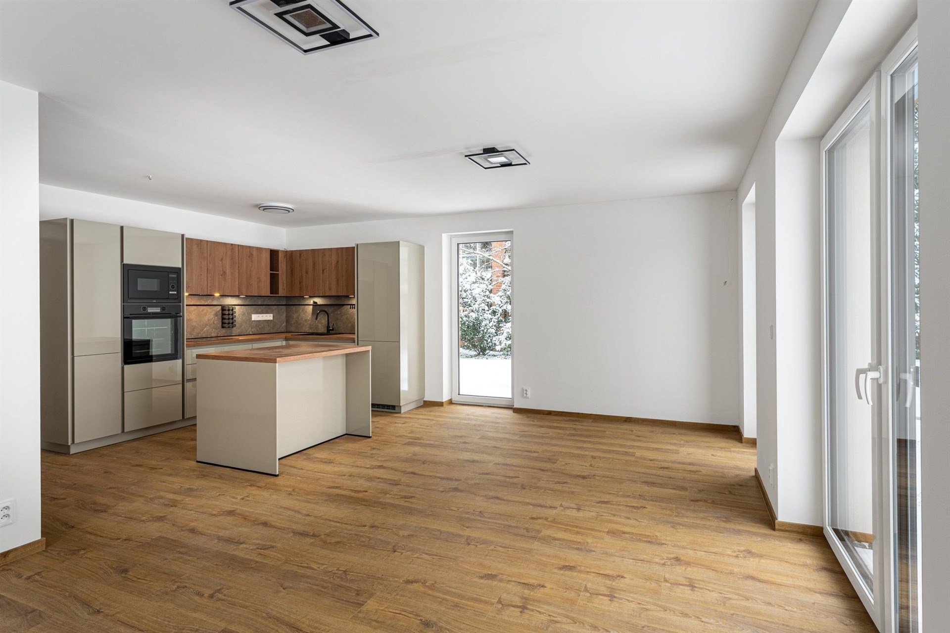 Prostorný obývací pokoj s velkou moderní kuchyňskou linkou a přímým vstupem na terasu, která obklopuje téměř celý dům. Prezentujeme kuchyni z domu C a dům C, který je již pronajatý. Aktuální dům B a kuchyně bude inzerována po její instalaci začátkem prosince 2025. Domy jsou postavené ve stejném standardu.