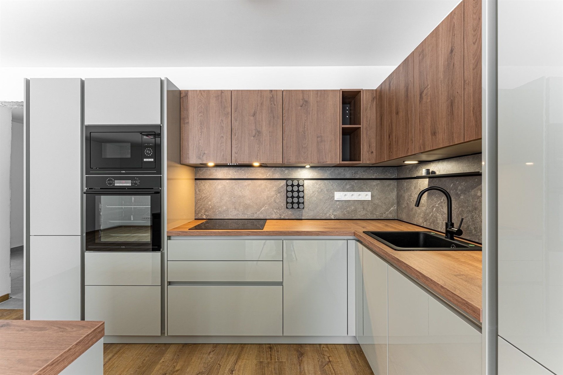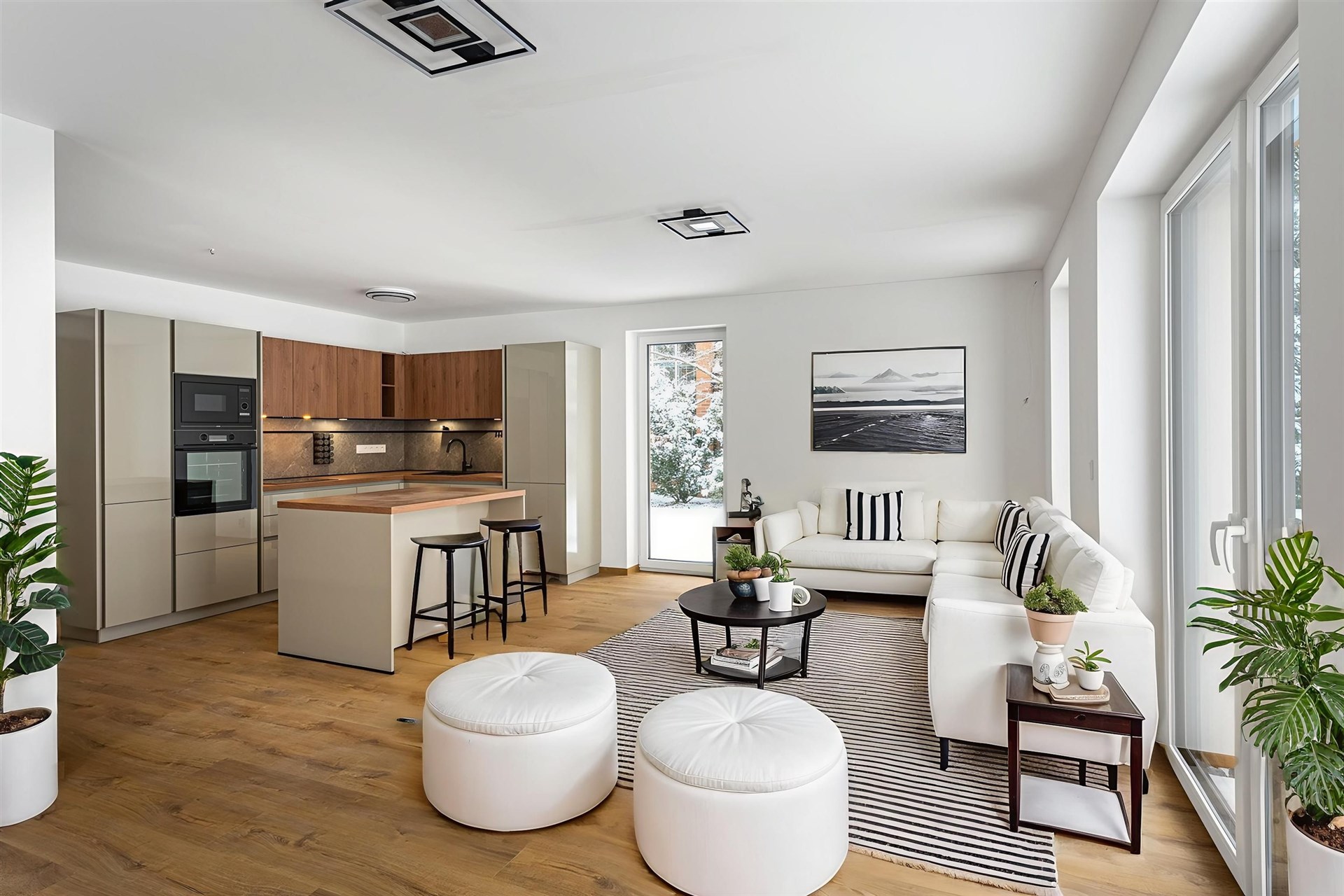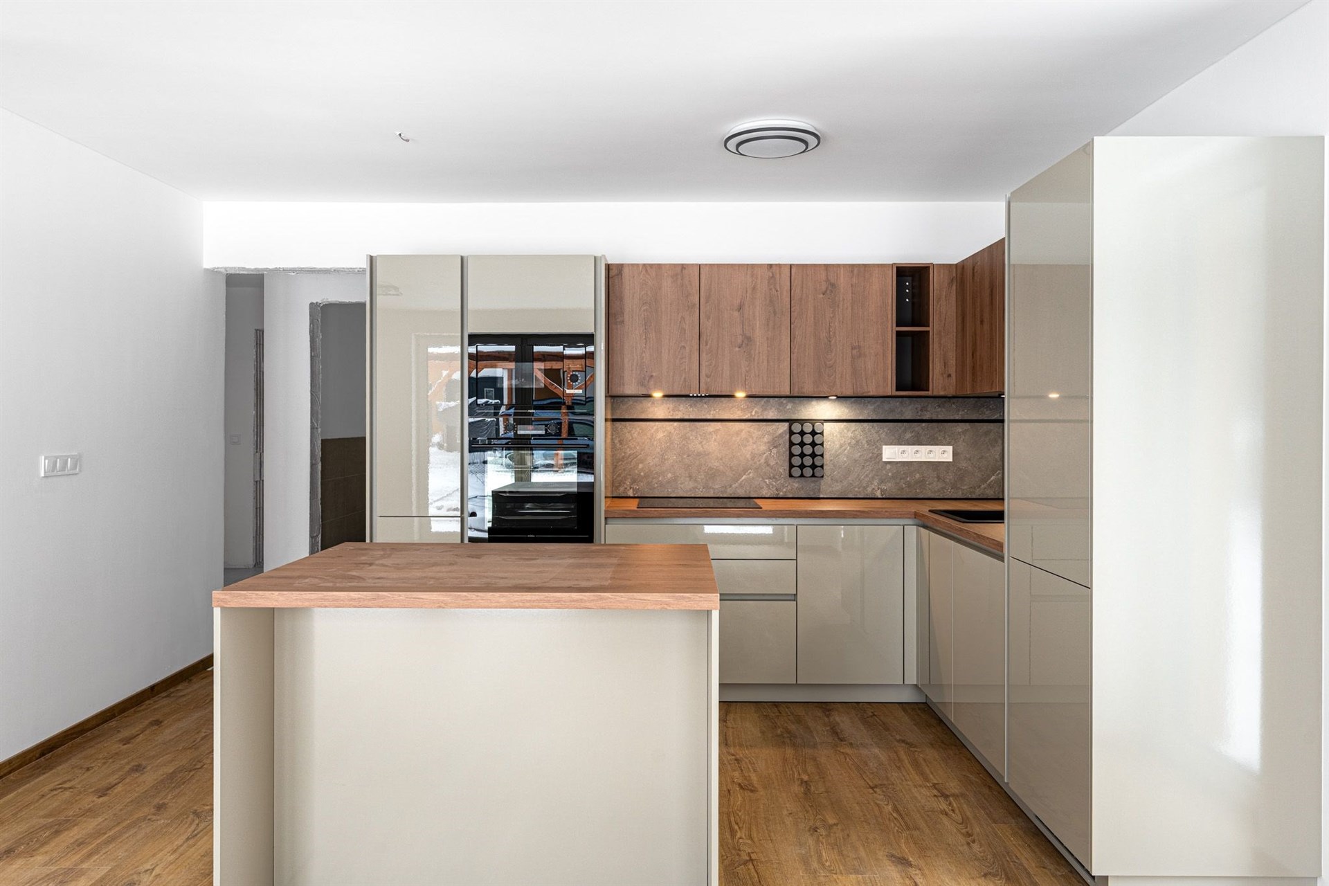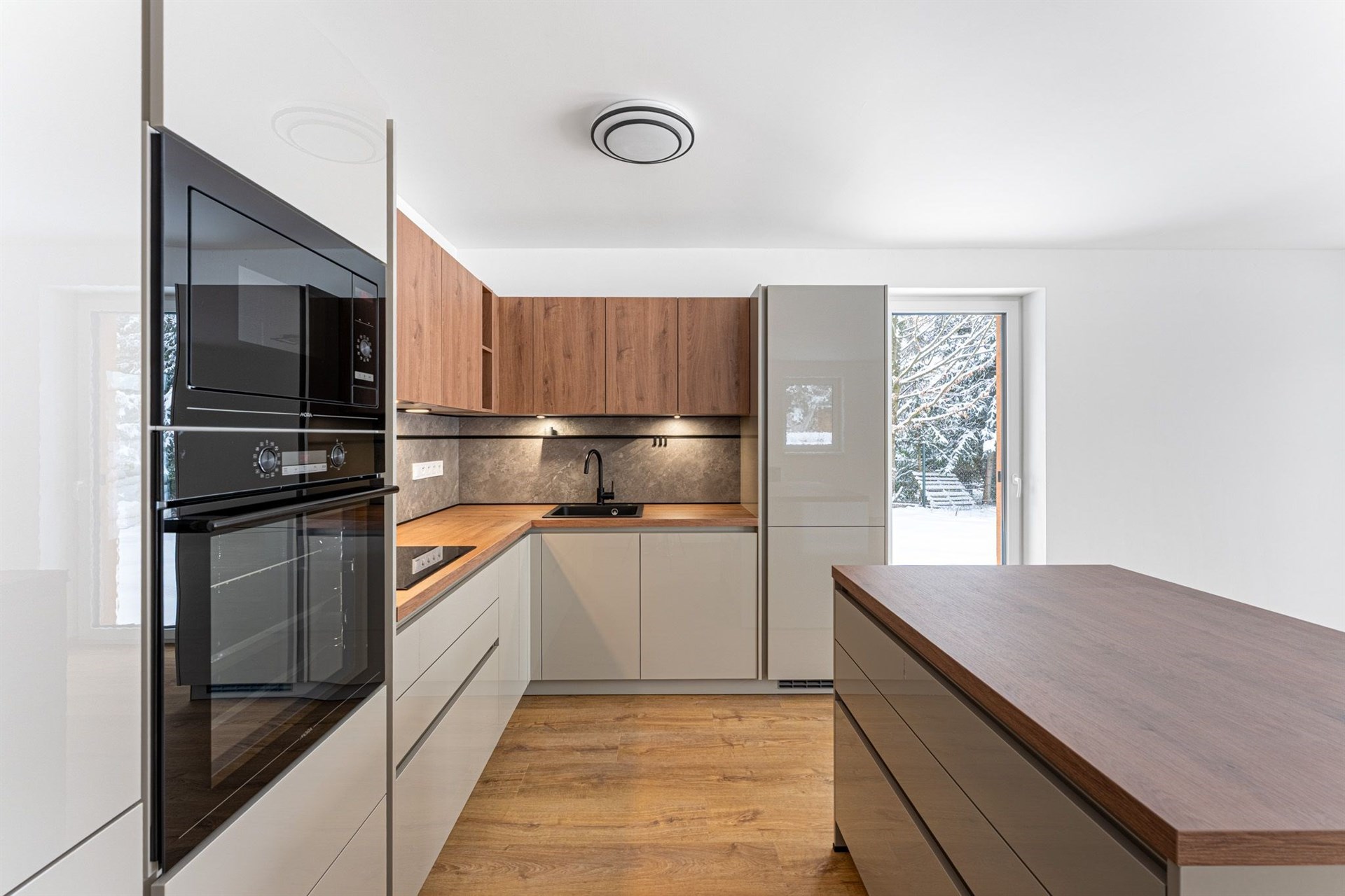 Prostorný obývací pokoj s velkou moderní kuchyňskou linkou a přímým vstupem na terasu, která obklopuje téměř celý dům. Prezentujeme kuchyni z domu C a dům C, který je již pronajatý. Aktuální dům B a kuchyně bude inzerována po její instalaci začátkem prosince 2025. Domy jsou postavené ve stejném standardu.