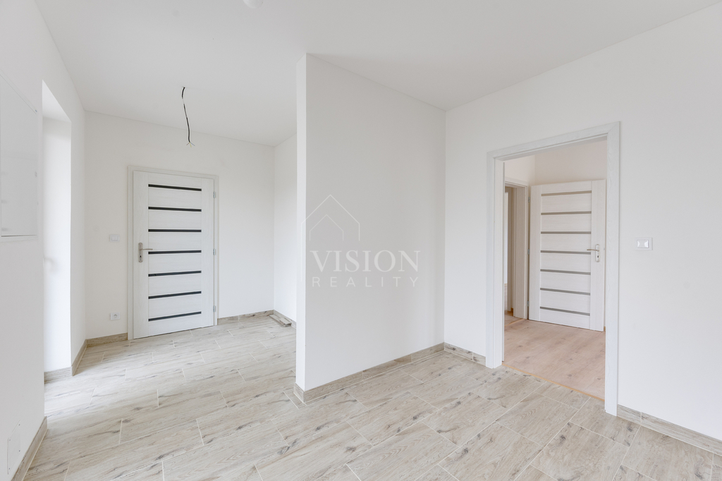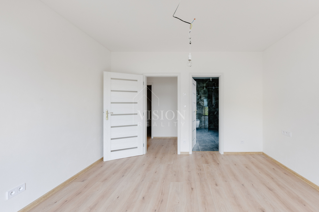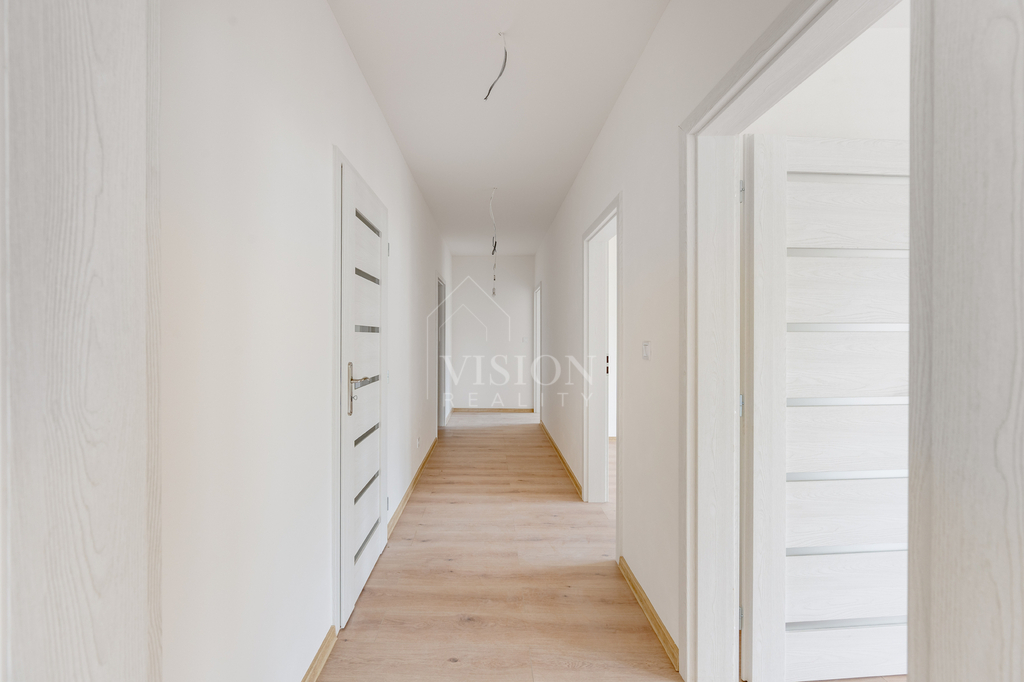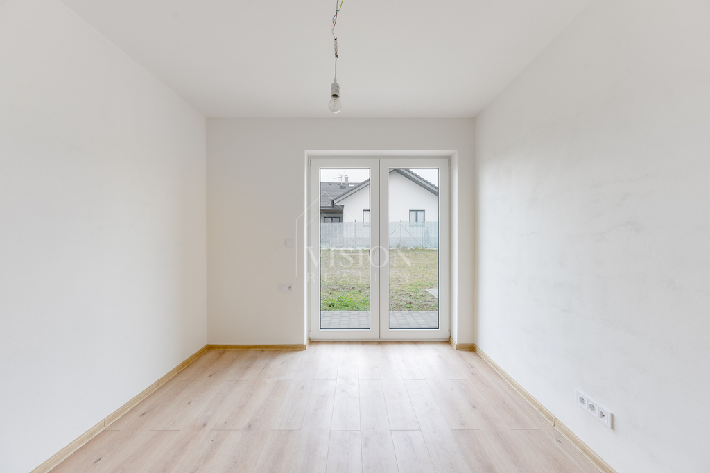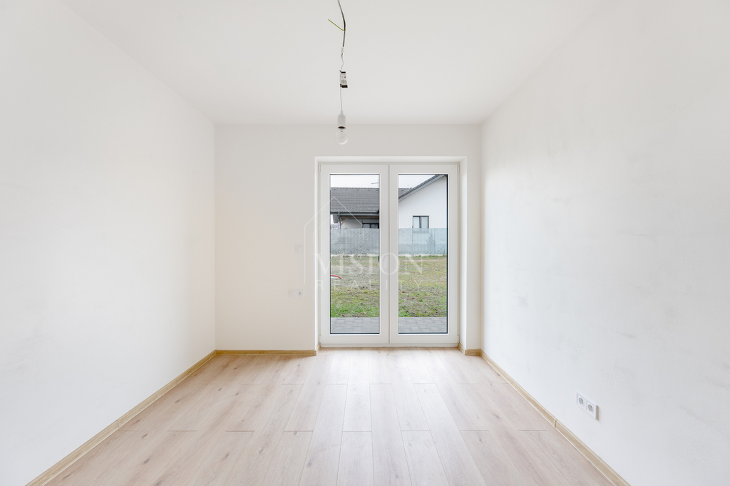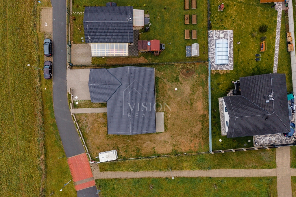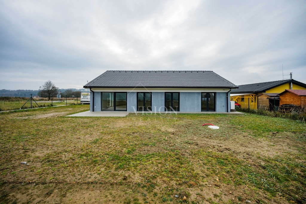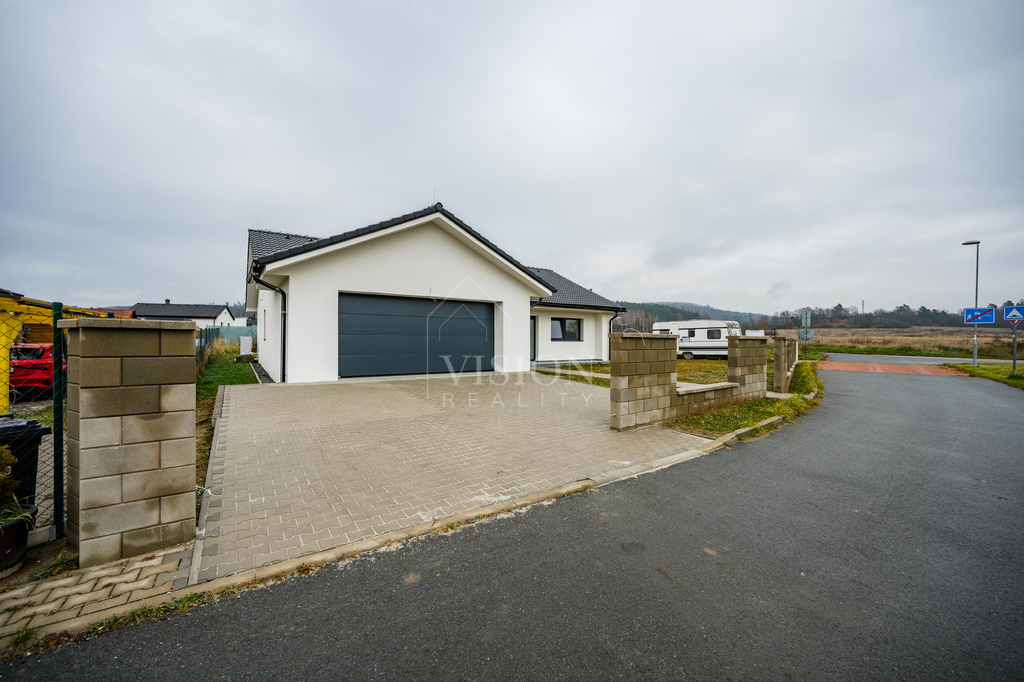 Dům o dispozici 4+kk nabízí 152 m² užitné plochy a stojí na oploceném pozemku 866 m². Z prostorné chodby můžeme vejít do garáže, což oceníme především v zimním období nebo projdeme do prostorného obývacího pokoje s kuchyňským koutem. Dále jsou zde dva pokoje a ložnice, která má i svou vlastní koupelnu. Nadstandardně velká okna zajišťují maximální prosvětlení interiéru a každý pokoj má přímý vstup na terasu a zahradu. K dispozici je další koupelna a také technická místnost, která poskytuje dostatek prostoru i jako úložný prostor.
