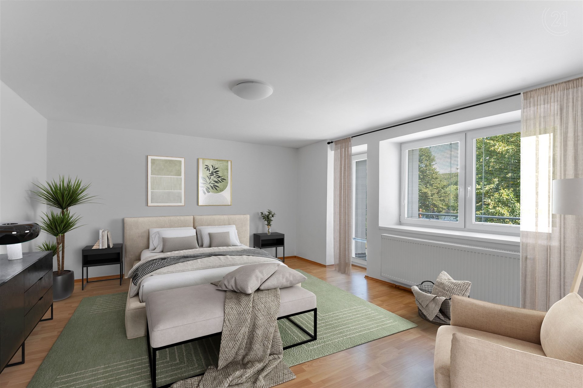 Bytová jednotka: velká ložnice, pokoj, obývací pokoj s kuchyňským koutem, koupelna, WC, spíž a balkon s výhledem.