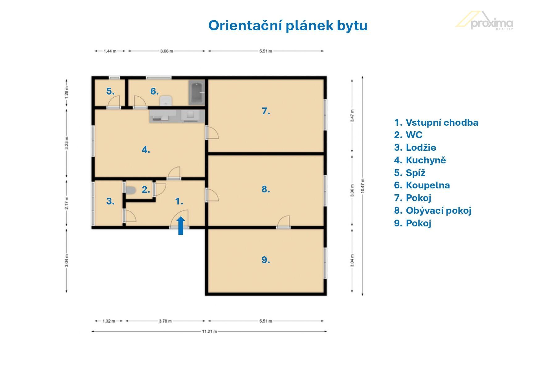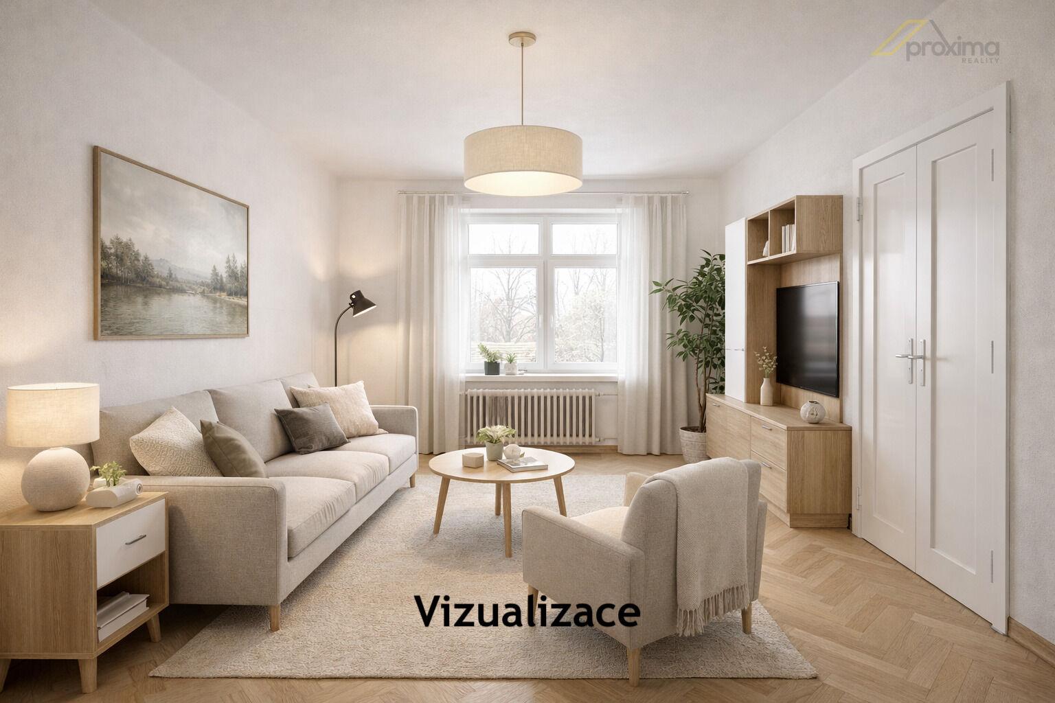 Dispozice bytu: vstupní hala, kuchyně se spíží, koupelna, samostatné WC, prostorná ložnice, průchozí obývací pokoj, další pokoj a zděná lodžie.