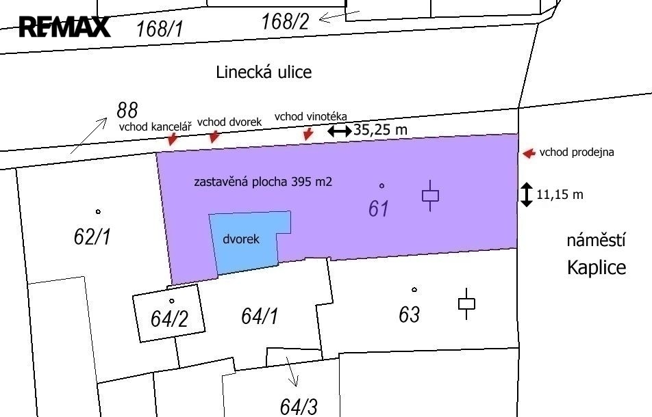 Objekt, tvořící roh náměstí je dvoupodlažní, částečně podsklepený, v dobrém stavu. Celková zastavěná plocha včetně dvorku je 395 m2.