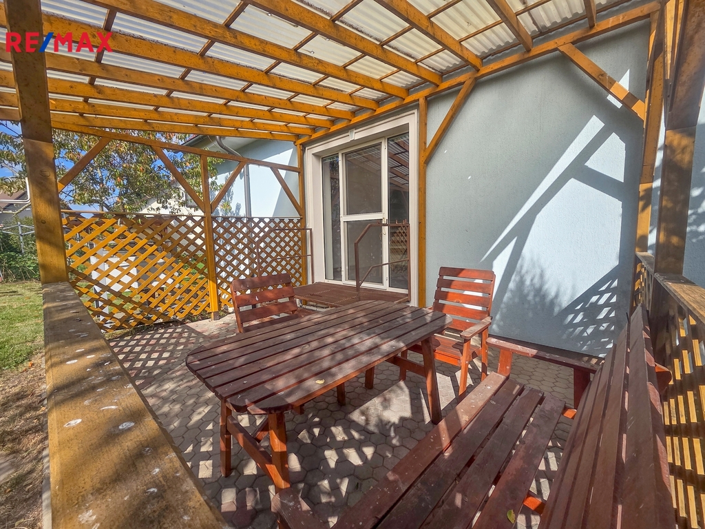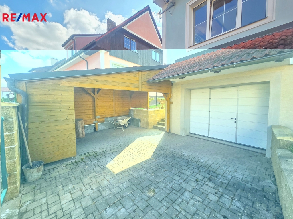 Před domem vedle garáže je vybudován dřevěný přístřešek. V zadní části zahrady je zděný zahradní domek (8 m2).