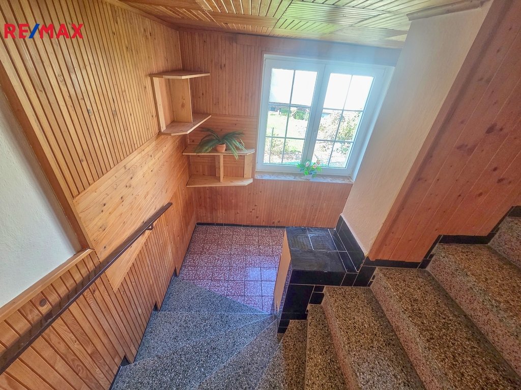 Z úzké šatny v 2.NP je přístup výsuvnými schůdky do podkroví, kam byla vyvedena elektřina, voda i kanalizace.