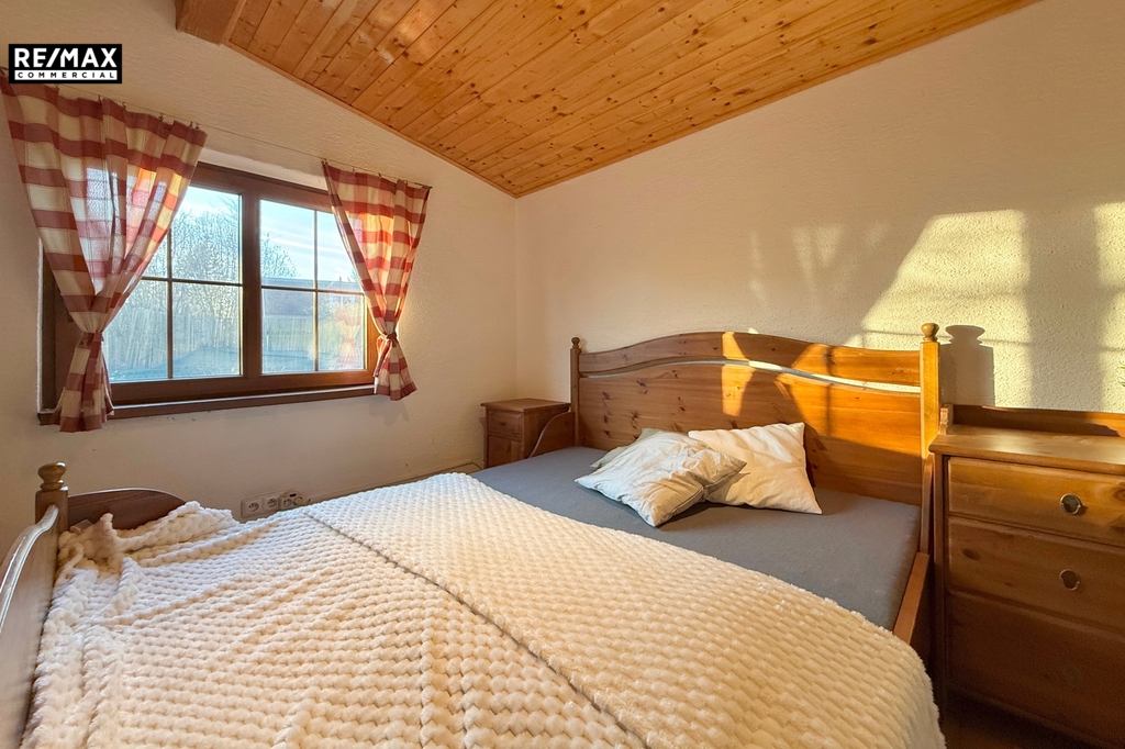 Vstup do chaty vede přes zastřešenou verandu, využitelná i jako příjemné posezení. Uvnitř je dominantou kuchyně a prostorný obývací pokoj, dále je k dispozici ložnice, menší pokoj a plnohodnotná koupelna. Chata s přehledem ubytuje celou rodinu. Součástí je garáž, fungující jako sklad.