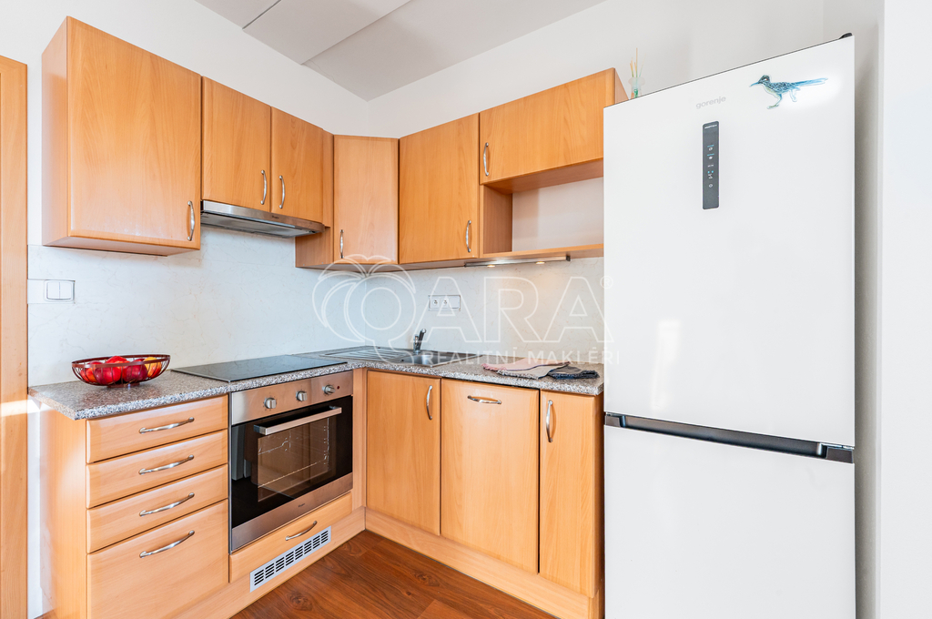 Součástí je kompletně vybavená kuchyňská linka včetně lednice, sklokeramické varné desky, trouby, myčky a digestoře. O teplo a teplou vodu se stará vlastní plynový kotel umístěný v praktické technické místnosti, kde je také pračka, která v bytě zůstává. Velká okna orientovaná na jih a jihozápad zajišťují dostatek denního světla po celý den. V oknech jsou žaluzie.