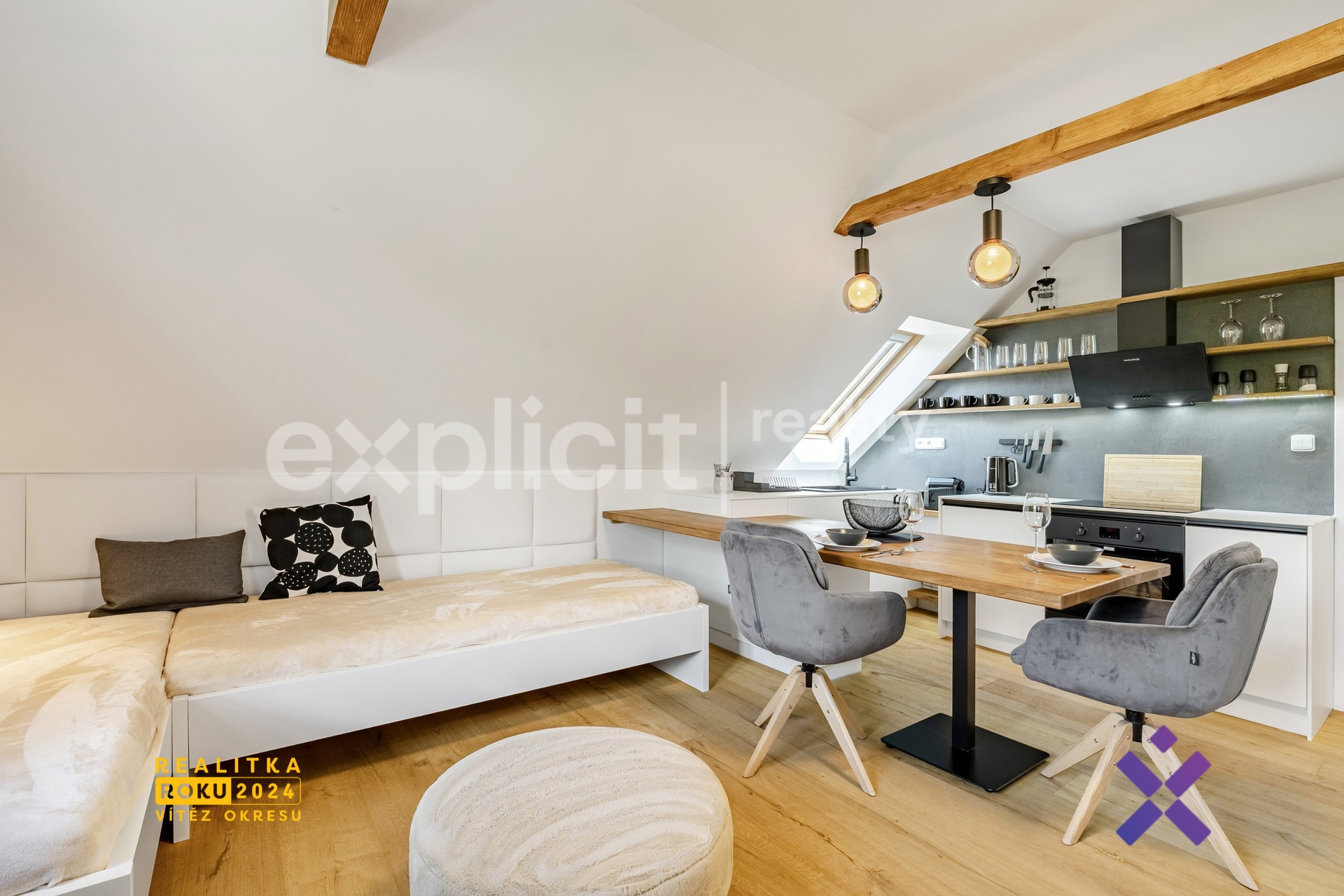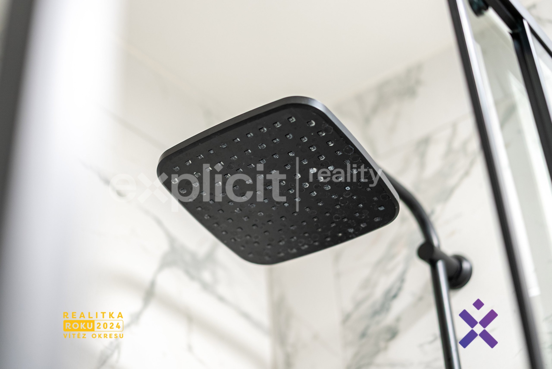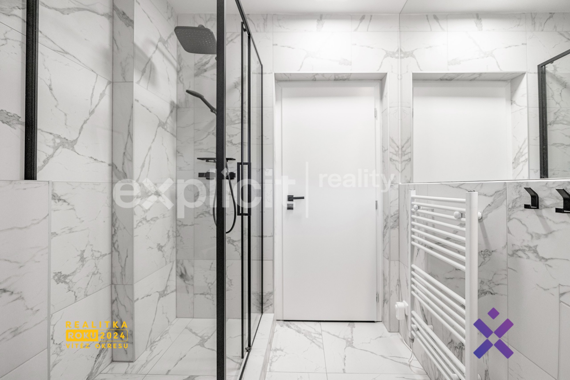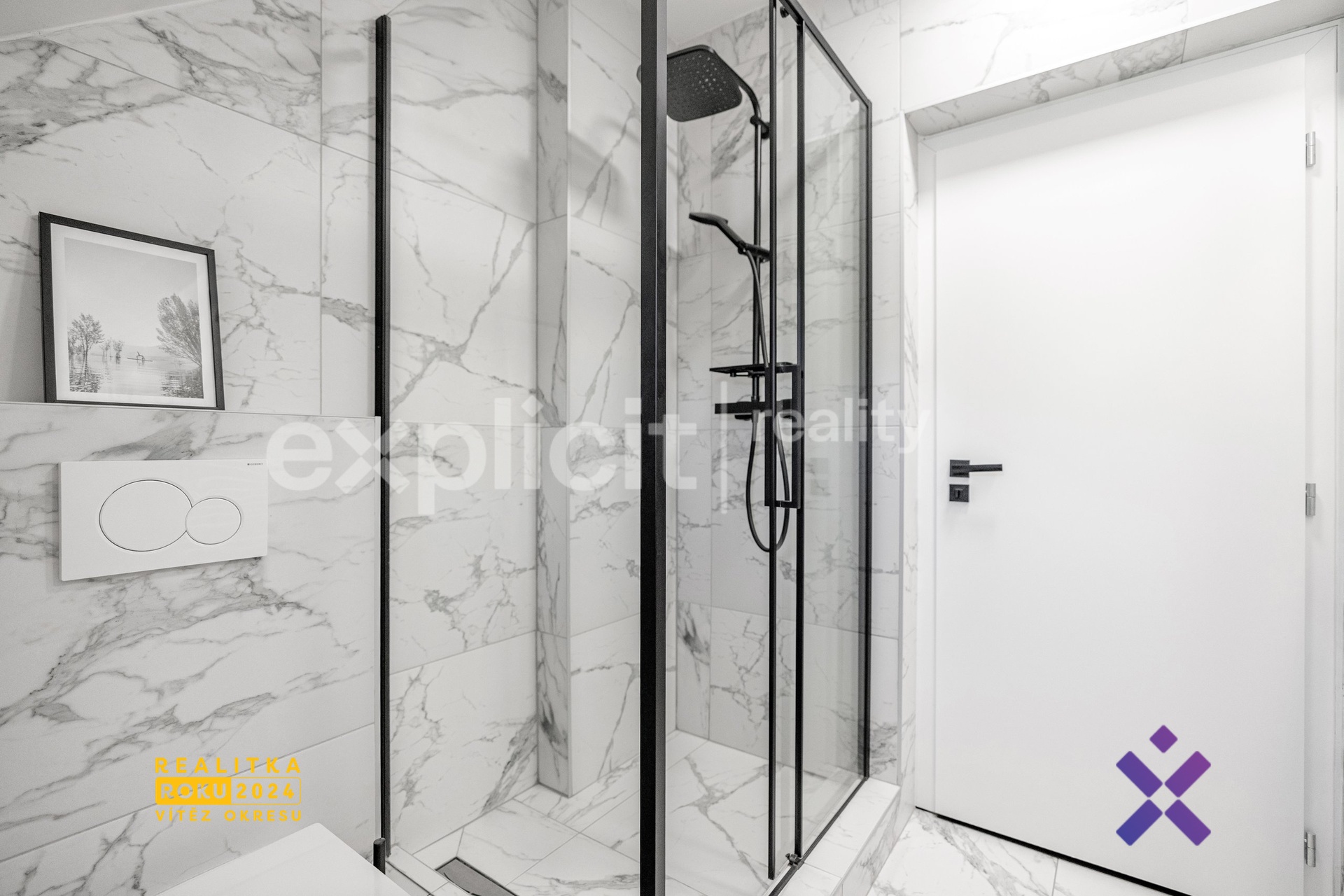 Interiér byl navržen s důrazem na moderní design a kvalitní provedení. Při rekonstrukci byly použity vysoce kvalitní materiály a celý apartmán je ve výborném, udržovaném stavu. Podlaha je vyrobena z masivního dubového dřeva. Dům, ve kterém se apartmán nachází, prošel kompletní rekonstrukcí před dvěma lety, je zateplený a společné prostory jsou ve výborném stavu díky aktivnímu fondu oprav.