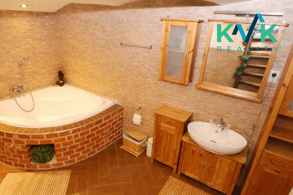 Byt prošel celkovou rekonstrukcí v roce 2016 a nabízí zajímavé dispoziční řešení. Prostorná koupelna o velikosti 12 m² je umístěna v 1. podzemním podlaží a je vybavena vanou, toaletou a prostorem pro pračku i sušičku. S hlavní částí bytu je propojena točitým schodištěm, což dodává bytu jeho jedinečný charakter.