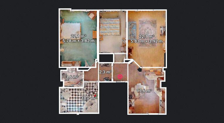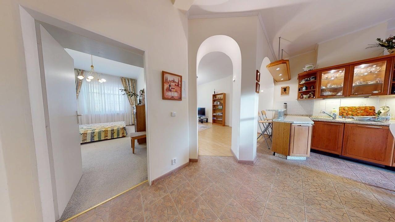 Celková plocha bytu činí 103,3 m². Díky této velkorysé výměře se nabízí zajímavý investiční potenciál: byt lze technicky rozdělit na dvě samostatné jednotky o dispozicích 1+1 a 2+1.
