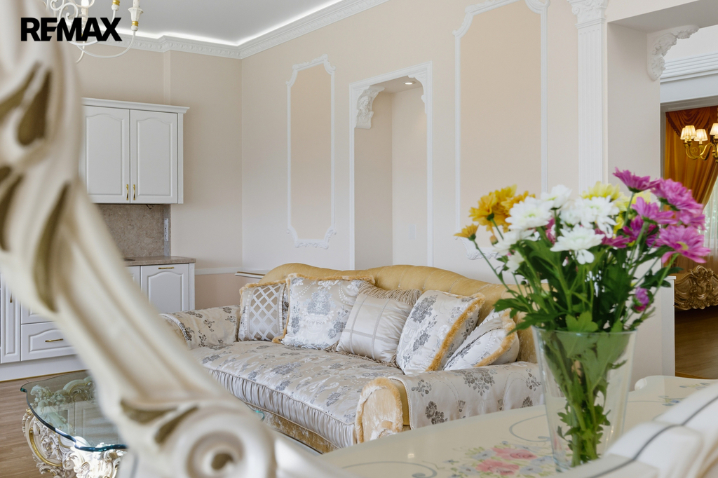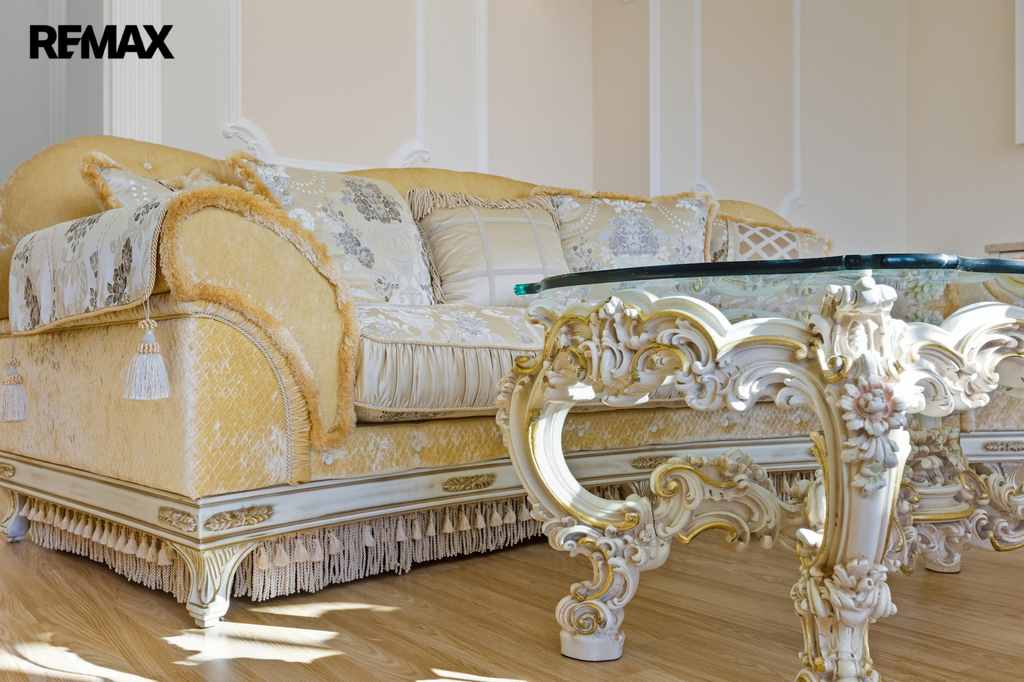 - Obývací pokoj s designovým zlatým gaučem, ručně vyřezávaným konferenčním stolkem a jídelním koutem s čalouněnými židlemi
