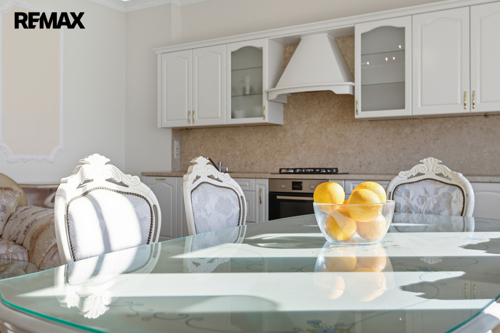 - Plně vybavená kuchyně s vestavnými spotřebiči a klasickými bílými skříňkami