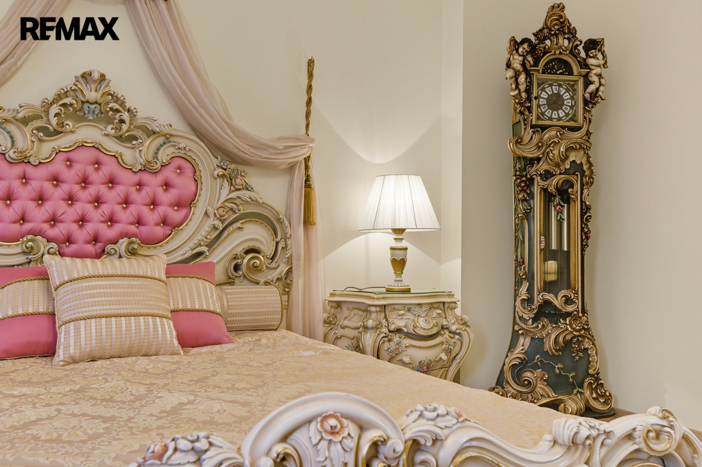 - Ložnice jako z pohádky: postel s bohatě zdobeným čelem a baldachýnem, nábytek ve stylu Ludvíka XV., impozantní toaletka a zdobné závěsy