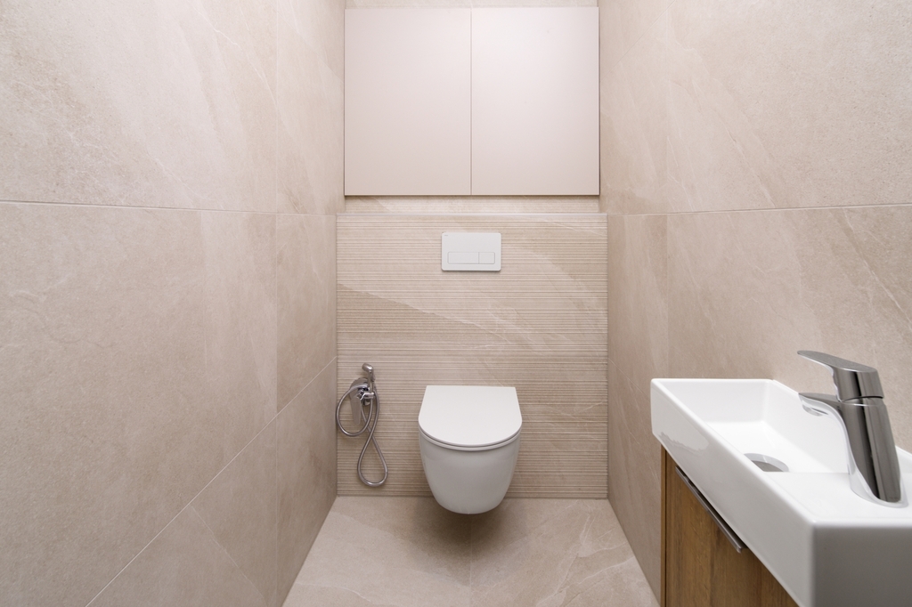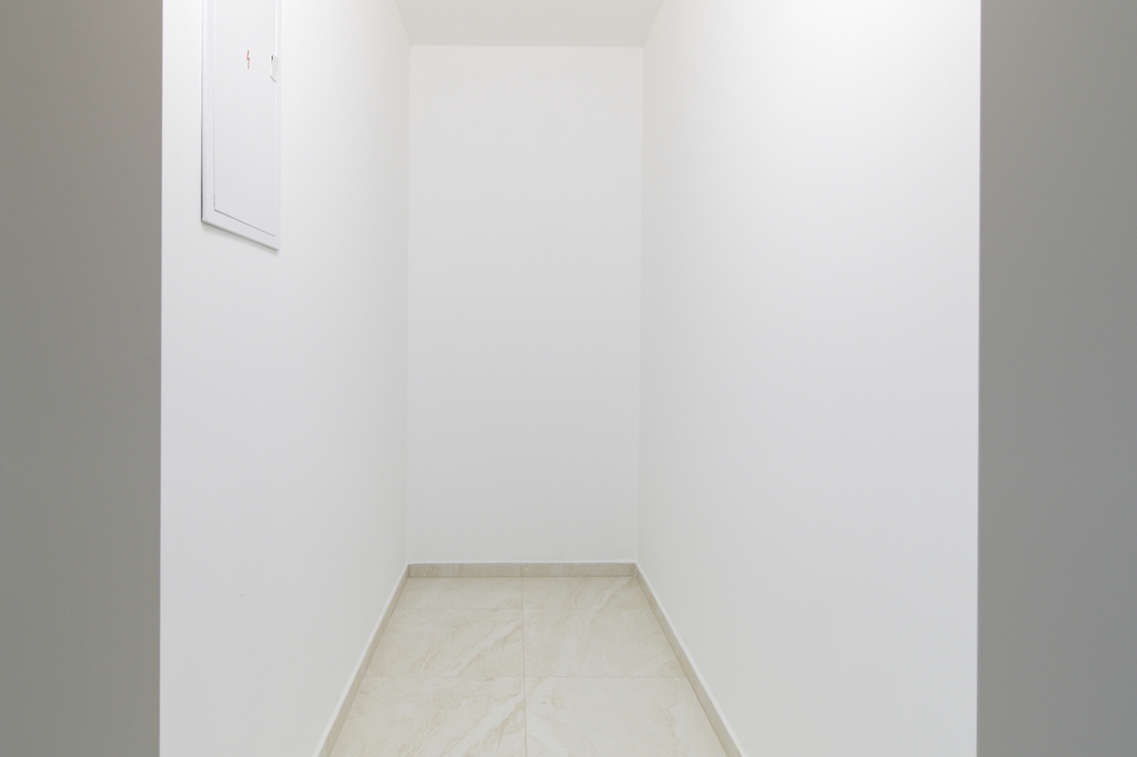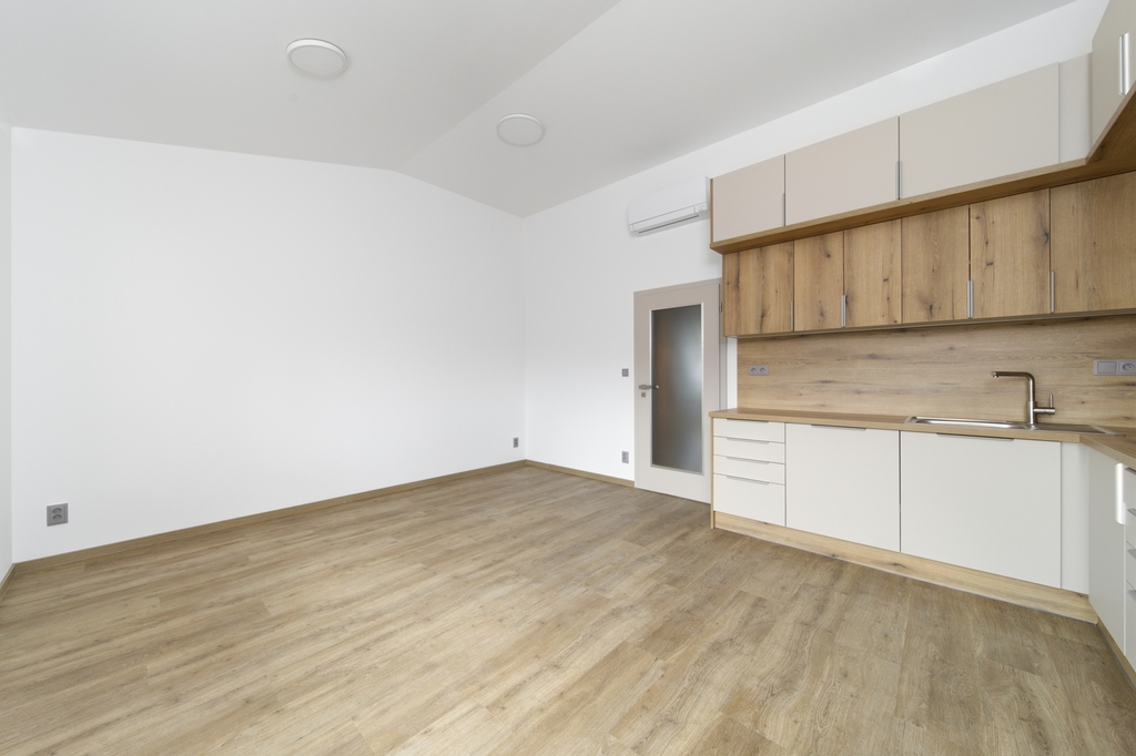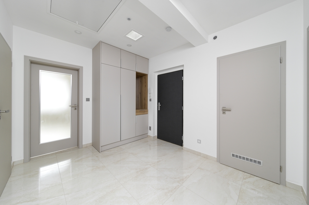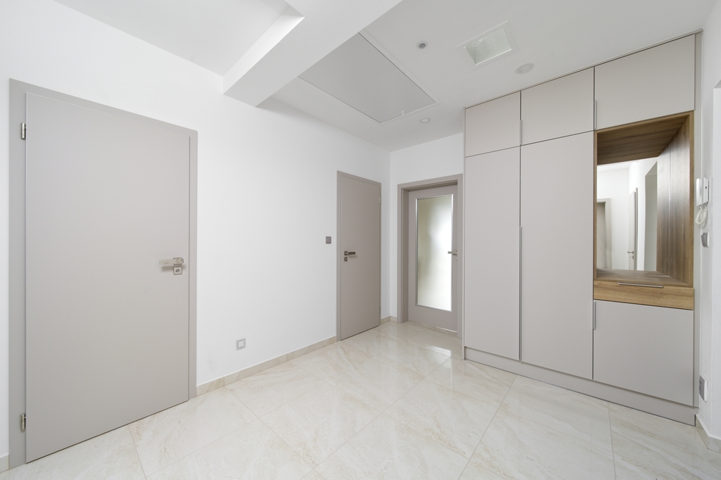 Součástí vybavení je moderní kuchyňská linka v nadčasovém designu, která zahrnuje vestavnou elektrickou troubu, indukční varnou desku, digestoř, myčku nádobí a ledničku s mrazákem. Koupelna je vybavena prostorným sprchovým koutem, dvojitým umyvadlem zasazeným do skříňky se šuplíky a praktickou zrcadlovou skříňkou. Nechybí ani přípojka na pračku a sušičku. Toaleta je oddělená a vybavena také bidetovou sprškou. V předsíni i obývacím pokoji se nachází vestavěné skříně na míru, které poskytují velkorysý úložný prostor. Celý interiér doplňuje moderní stropní i podlinkové osvětlení.