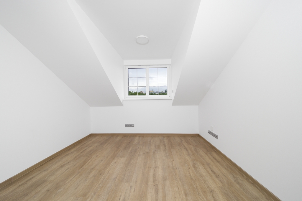 Dispozice bytu je velmi praktická. Ze vstupní předsíně je samostatný vstup do všech místností, a to do obývacího pokoje s kuchyňským koutem, ložnice, dětského pokoje, komory, koupelny a na samostatné WC. Z obývací části je přímý vstup na zasklenou lodžii, která nabízí krásný výhled na centrum města a široké okolí. Díky zasklení je možné lodžii pohodlně využívat i v chladnějších měsících. Velkorysé úložné možnosti nabízí podkrovní prostor přístupný po skládacích půdních schodech přímo z bytu (není zachyceno na fotografiích). K bytu náleží zděná sklepní kóje (2 m²) v suterénu domu.