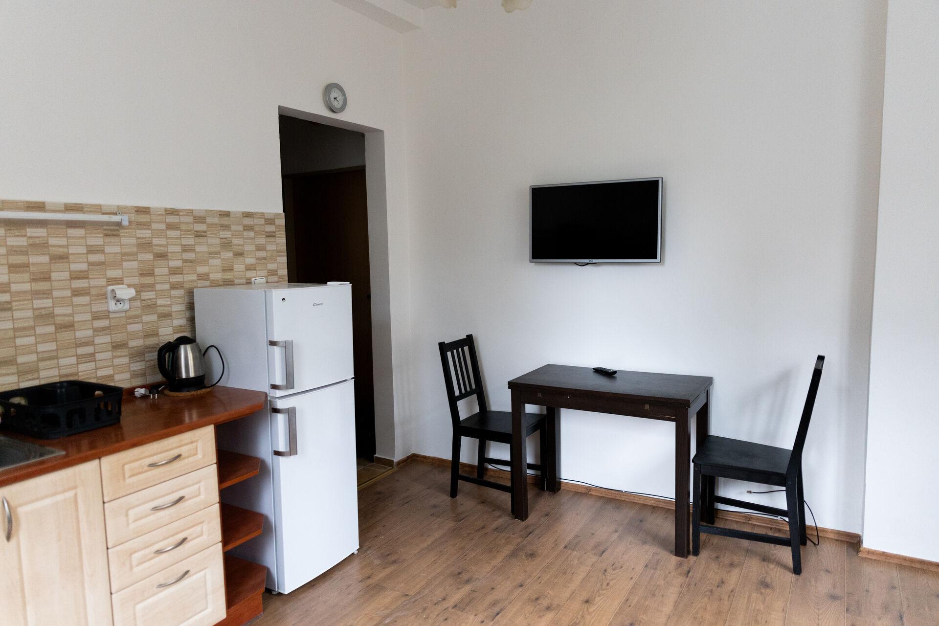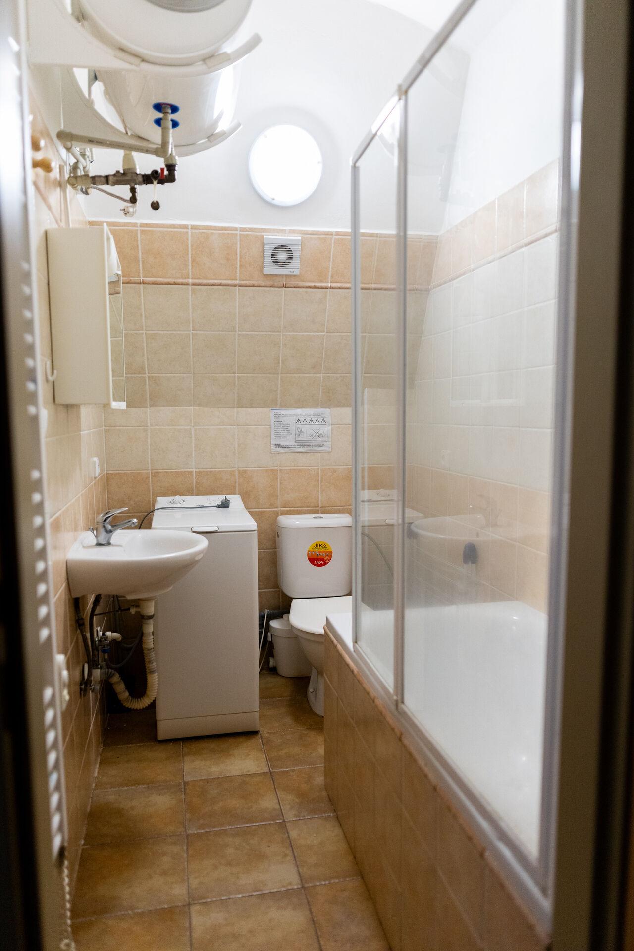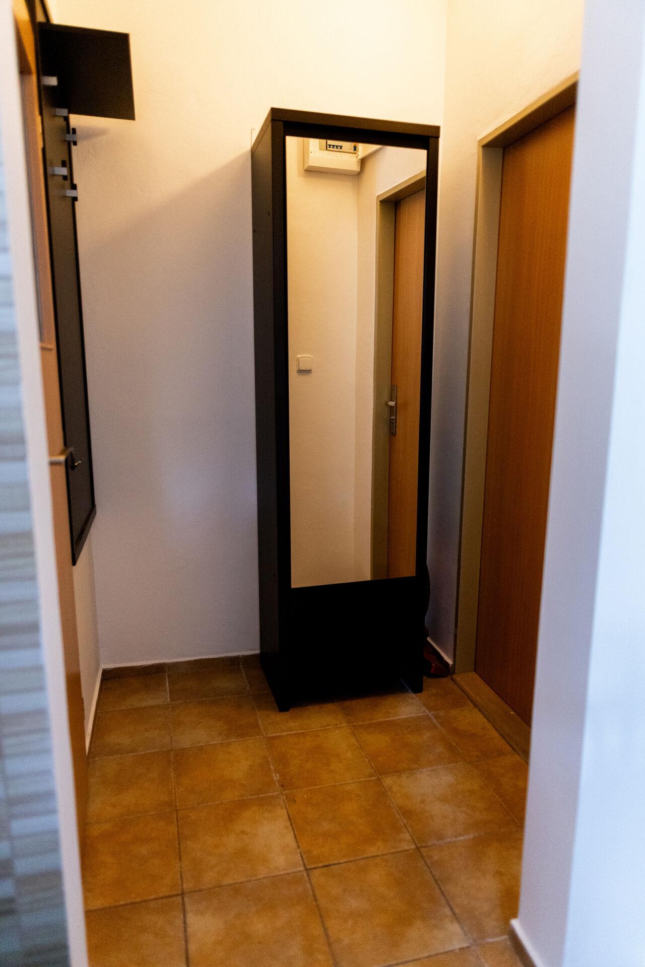 Vnitřní prostor bytu je chytře koncipován pro maximální využití každého metru a díky vysokým stropům se zde nabízí možnost vybudování patra na spaní, čímž lze výrazně zvětšit obytnou plochu. Interiér je kompletně zařízen a připraven k okamžitému nastěhování nebo pronájmu. Najdete zde vstupní chodbu s úložným prostorem, hlavní místnost s vybavenou kuchyňskou linkou a pohodlnou rozkládací pohovkou, koupelnu s vanou a toaletou. Vytápění je zajištěno elektrickými přímotopy a ohřev vody vlastním elektrickým bojlerem.