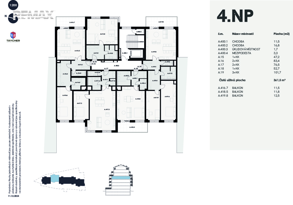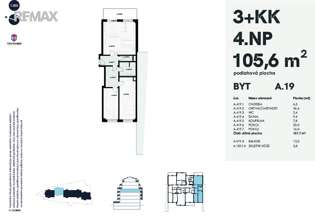 Prodej bytu A19, NOVOSTAVBA, 3+kk 105,6 m2 + balkon 12,5 m2 + sklep