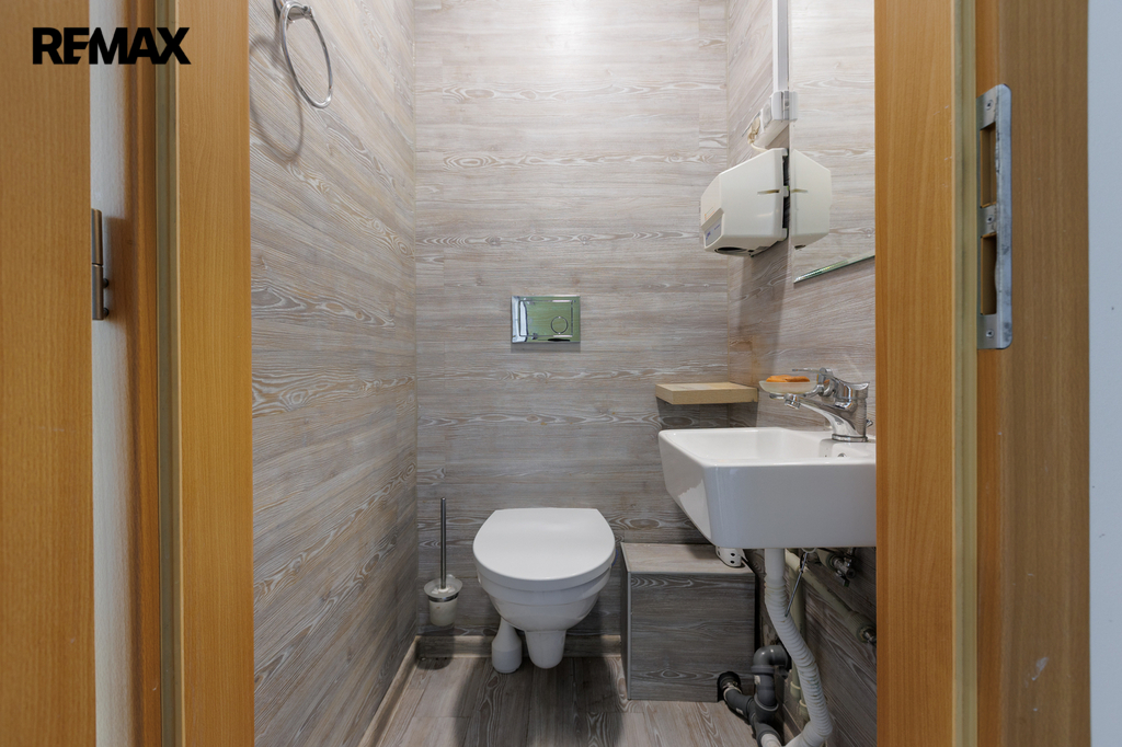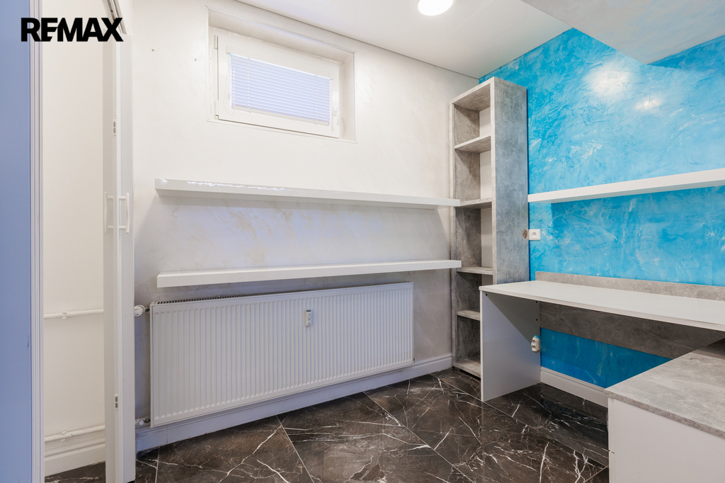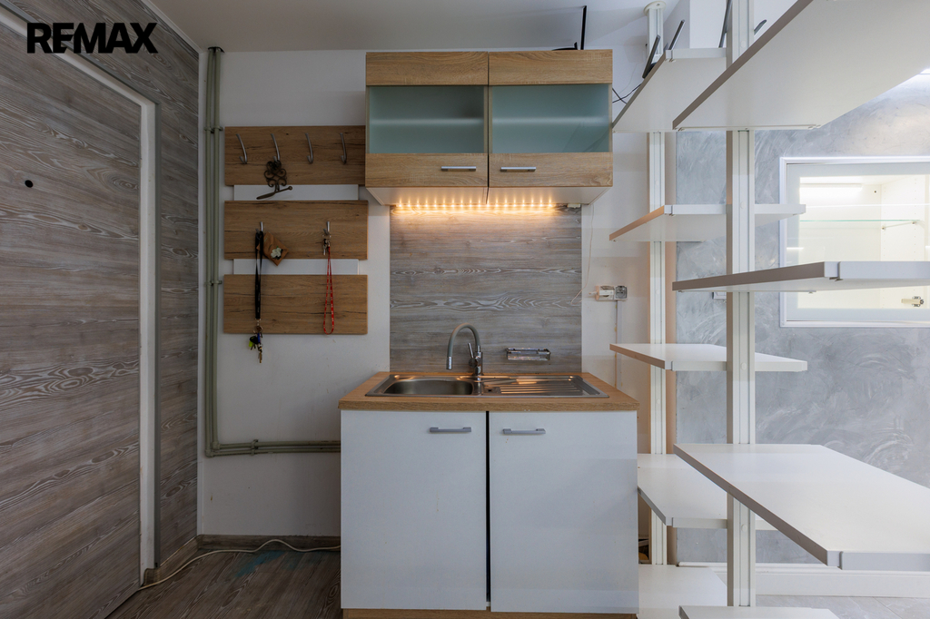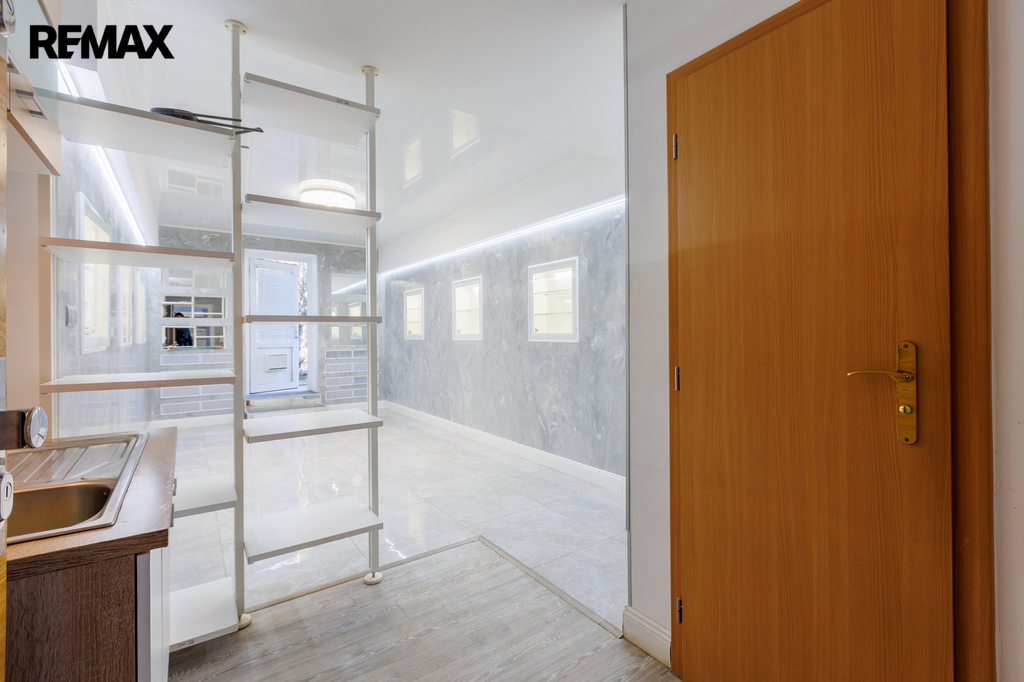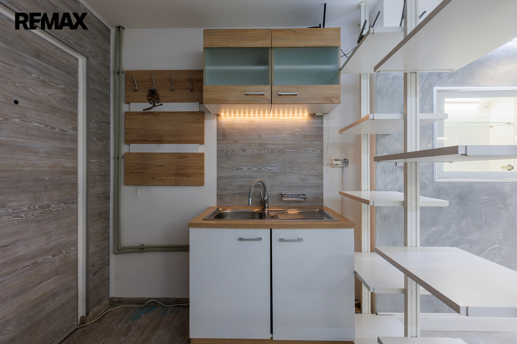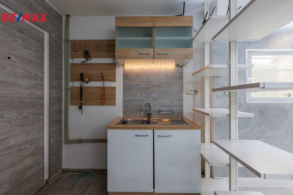 Velkou výhodou je, že prostory jsou částečně vybaveny. K dispozici je kuchyňská linka, základní kancelářský nábytek, vestavěné skříňky na míru s moderním LED podsvícením, regály, pracovní stoly a komoda. Součástí je také praktická úklidová místnost a samostatné WC.