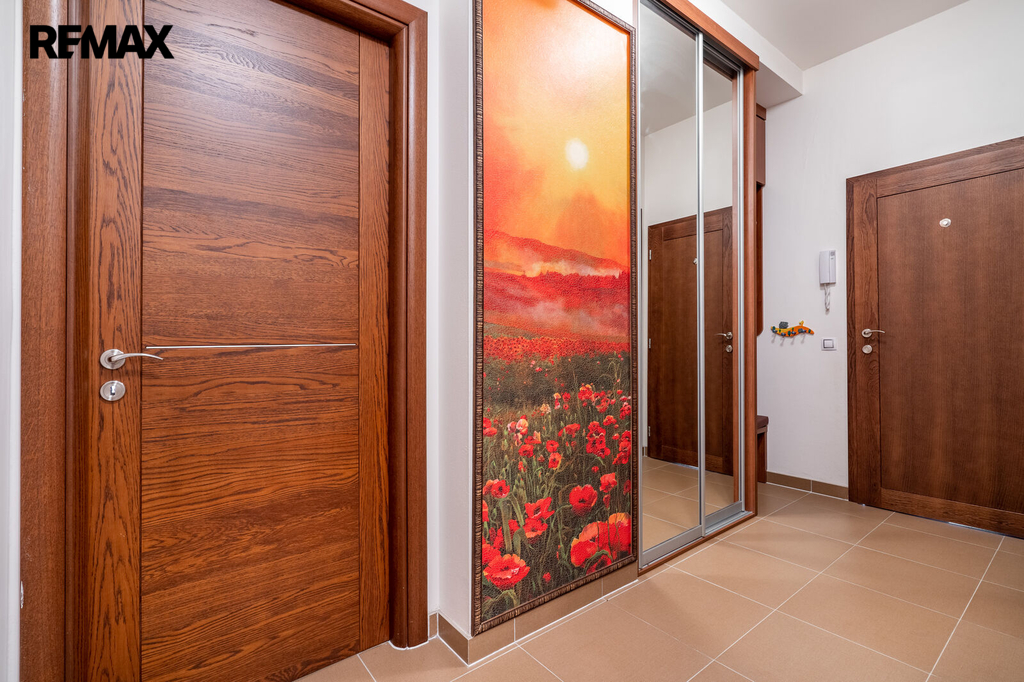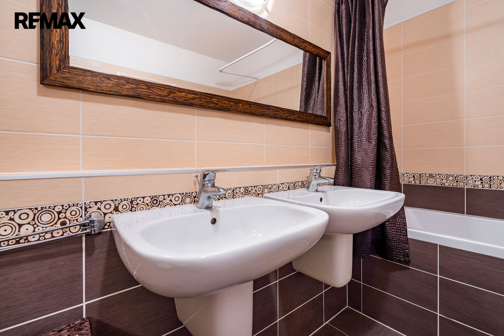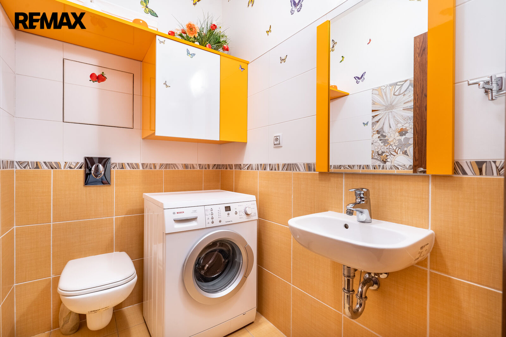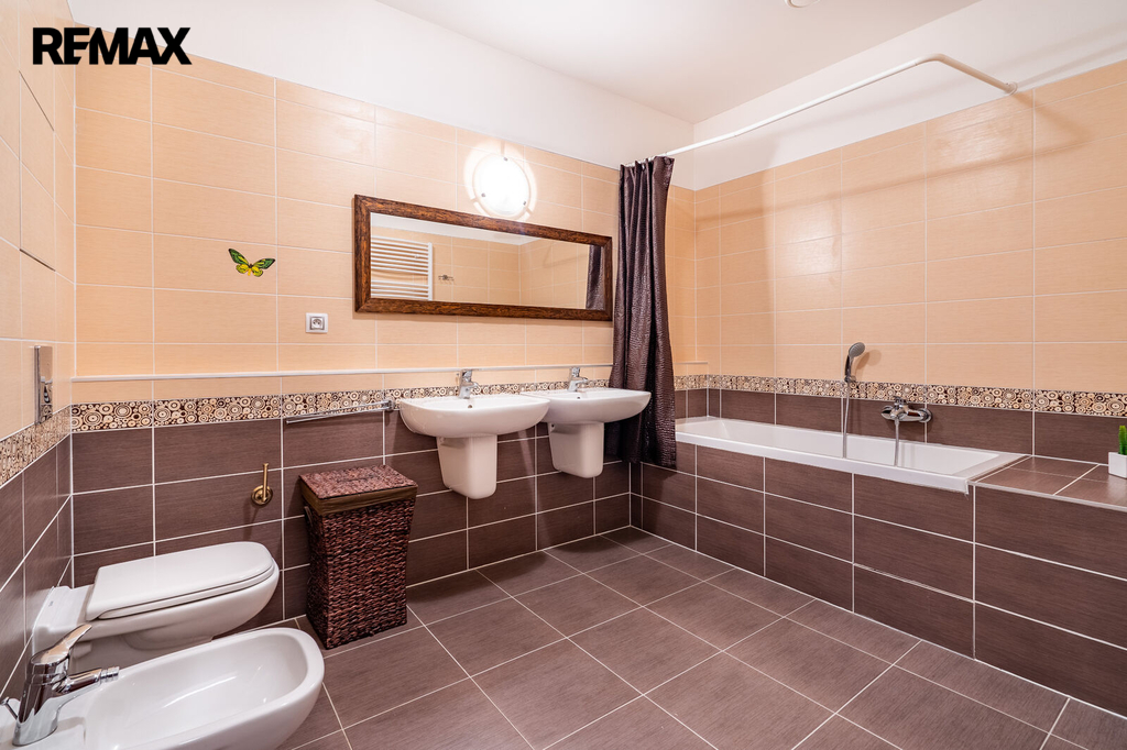 Byt je vybaven moderní koupelnou s kvalitními zařizovacími prvky a dvěma samostatnými toaletami, což ocení zejména vícečlenné domácnosti. Celý interiér je kompletně zařízen, což znamená, že si stačí přinést osobní věci a můžete se ihned nastěhovat. Nábytek i spotřebiče jsou pečlivě vybrané tak, aby odpovídaly současným trendům a poskytovaly maximální funkčnost i estetiku.