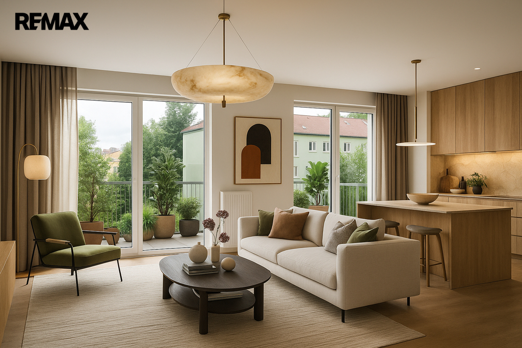 Prostorný obývací pokoj s kuchyňským koutem a vstupem na hlavní terasu.