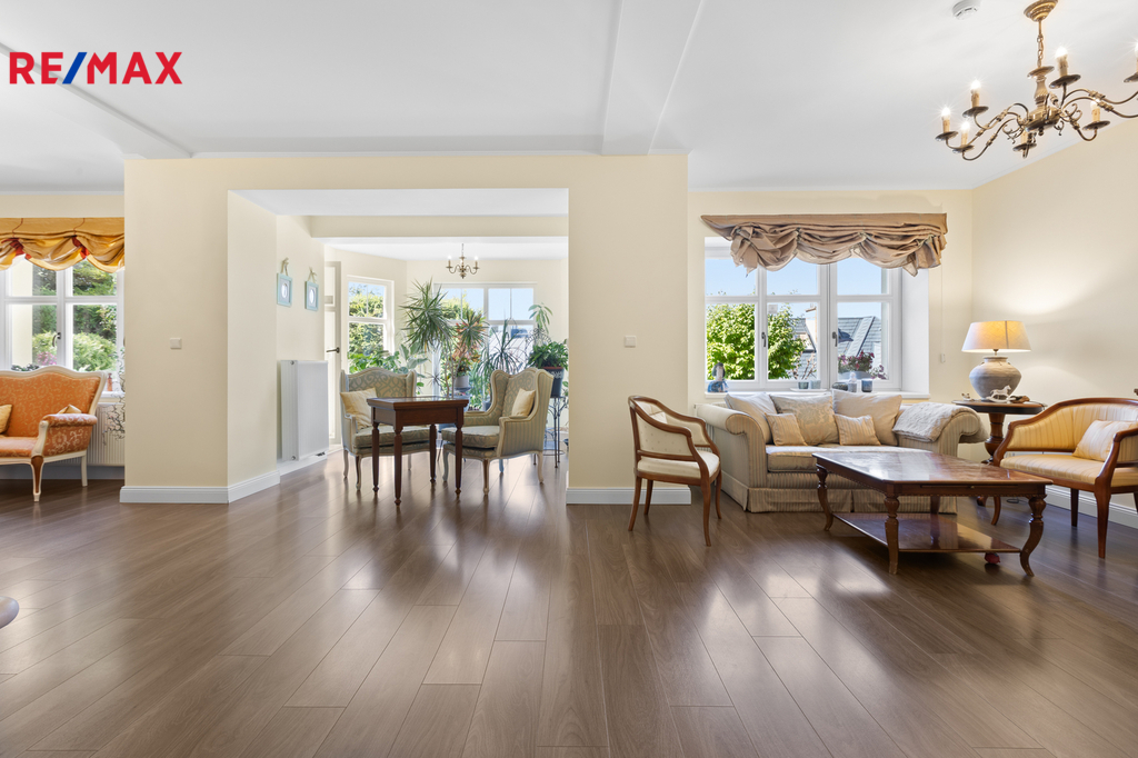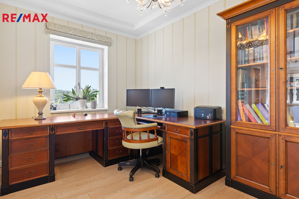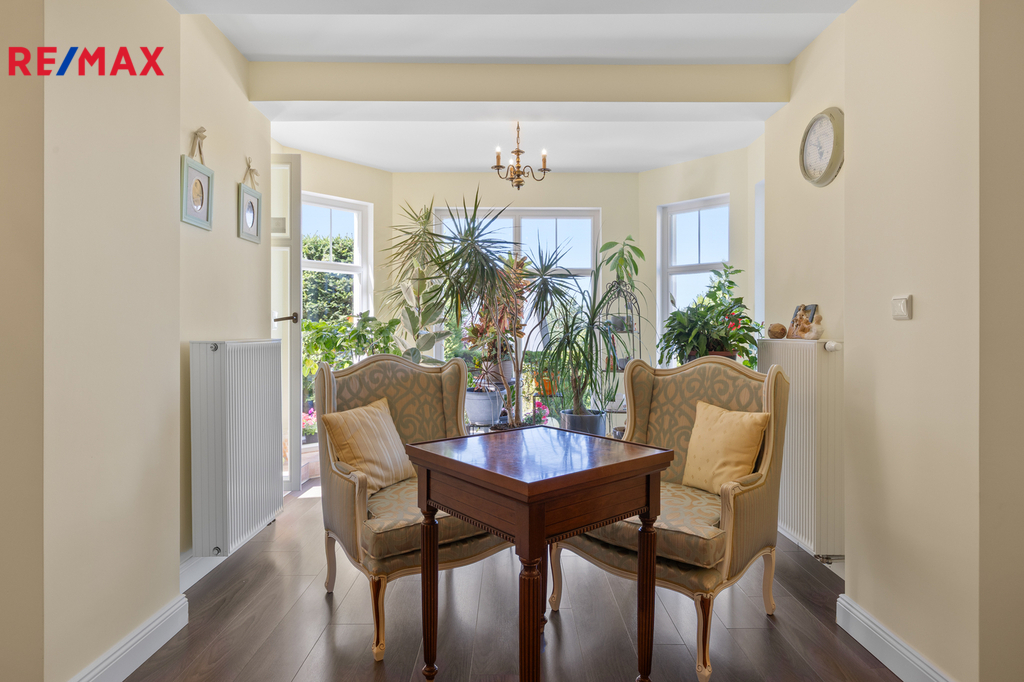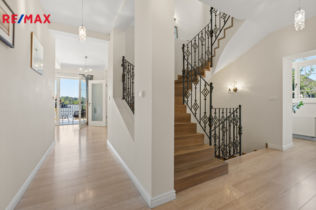 V přízemí Vás přivítá prostorný obývací pokoj s krbem, který plynule přechází do jídelny, zimní zahrady a elegantní kuchyně. Každý kout je promyšlený, každý detail navržený s láskou. Z obývacího pokoje vede cesta přes zimní zahradu na terasu, kde stojí altán s kamenným grilem a jezírkem s vodopádem – ideální místo pro letní večery pod hvězdami.
