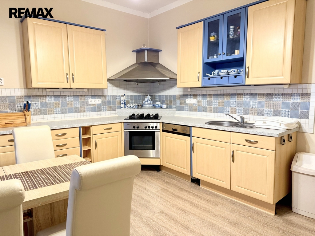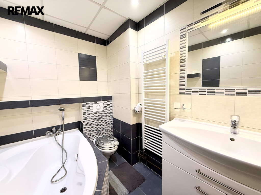 Součástí bytu je nová kuchyňská linka, lednice, mrazák, mikrovlnka, trouba, plynový sporák, v koupelně nová vana s pračkou, vestavěné skříně.