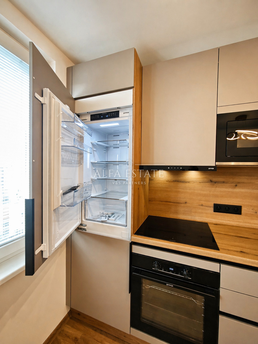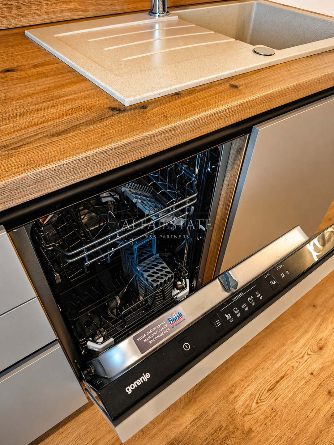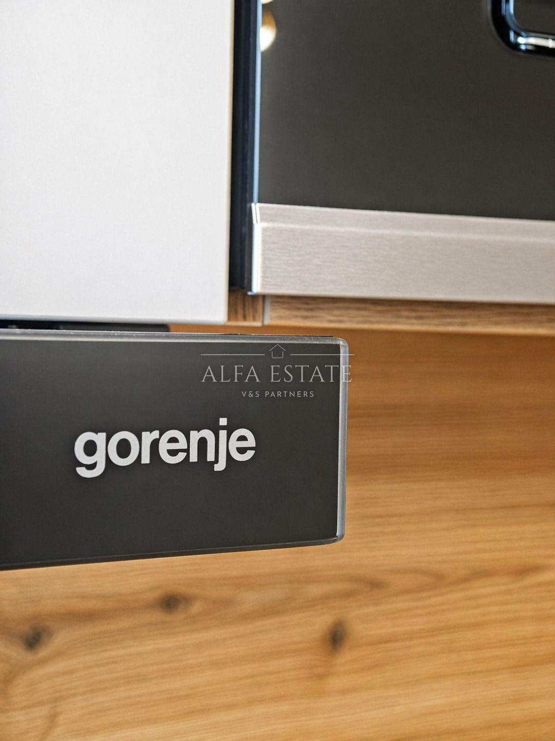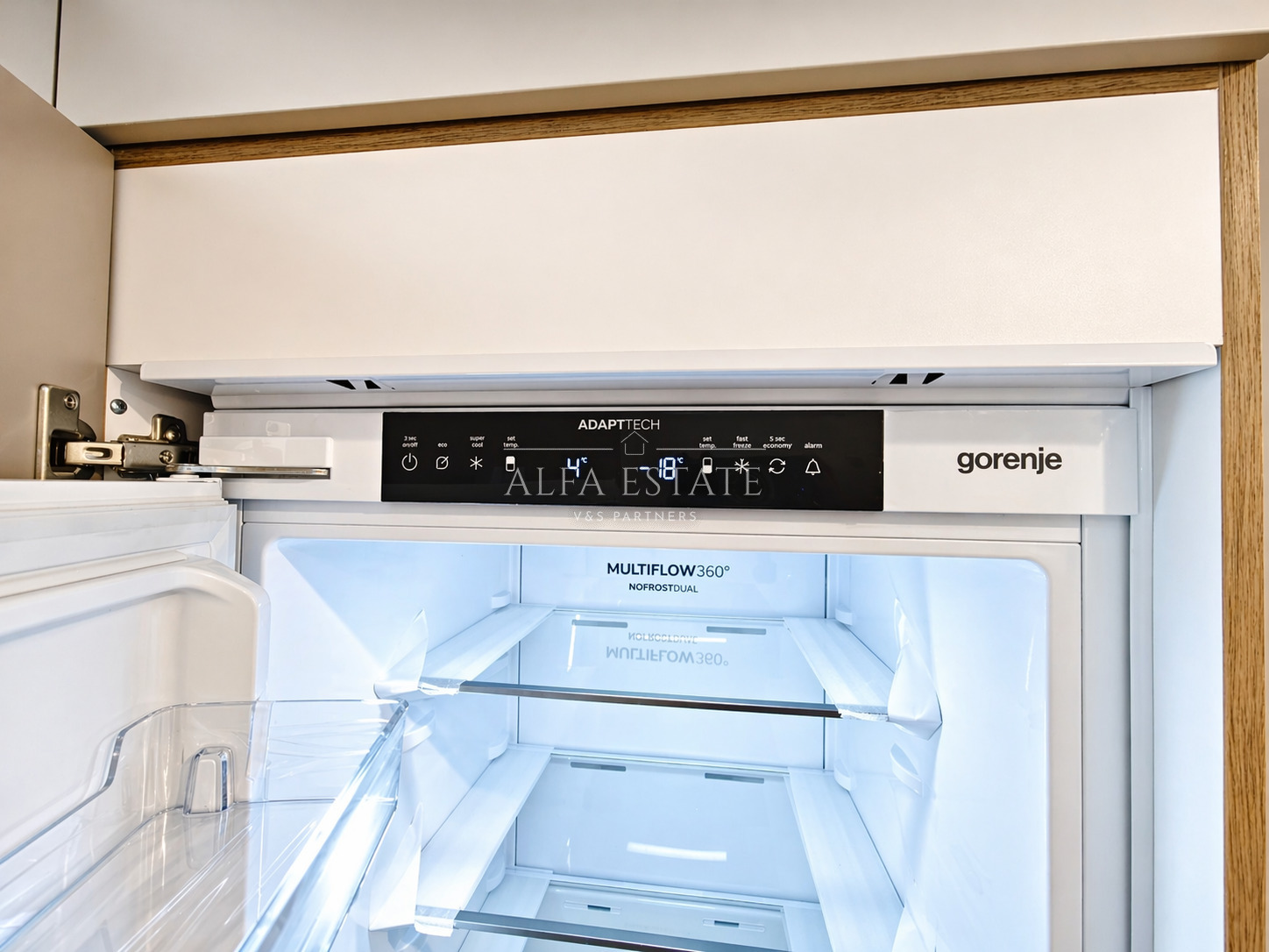 Srdcem bytu je moderní kuchyňská linka vyrobená na míru se spotřebiči značky Gorenje, která elegantně navazuje na obývací část a vytváří otevřený, vzdušný a příjemný obytný prostor. Ve stejném kvalitativním standardu byla zhotovena také prostorná vestavěná skříň v předsíni, rovněž značky Gorenje. Koupelna byla navržena s důrazem na estetiku i praktičnost a nabízí prostorný sprchový kout o velikosti 120 cm i citlivě řešený prostor pro pračku a sušičku.