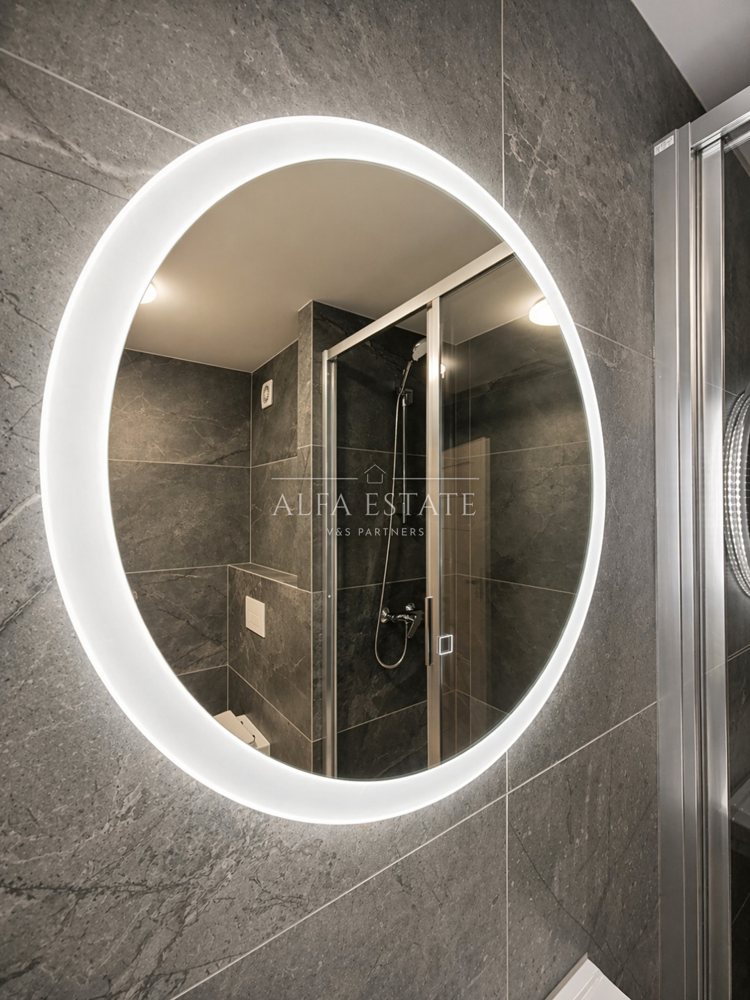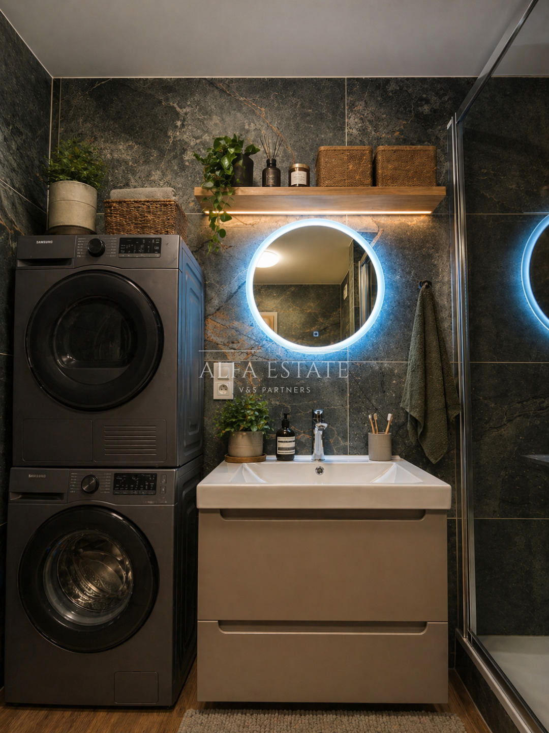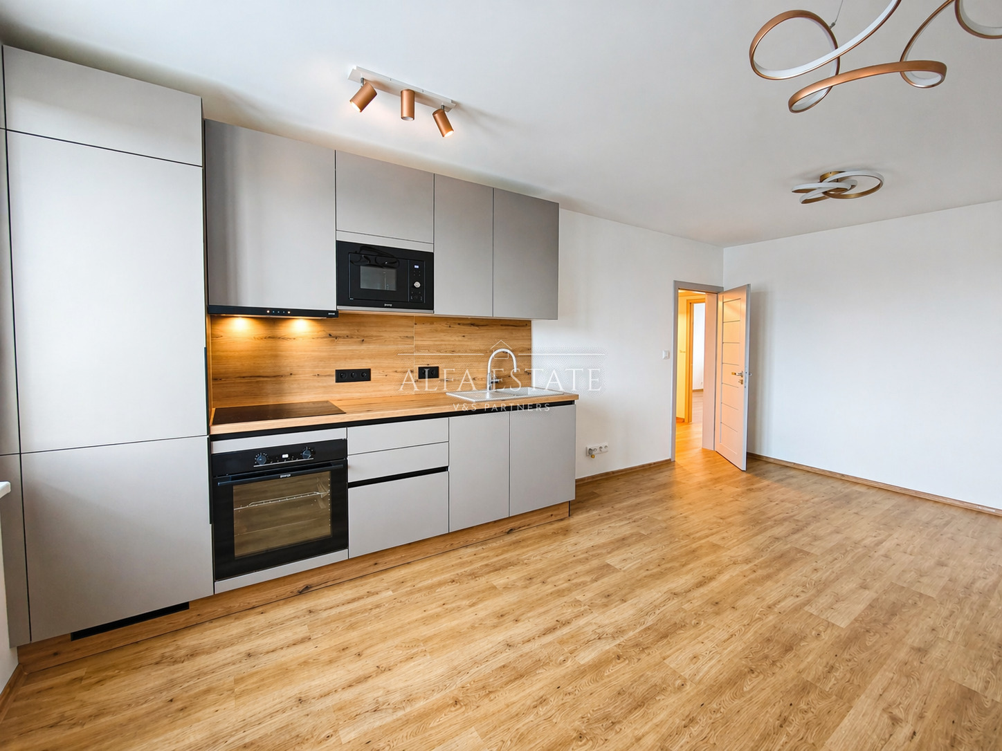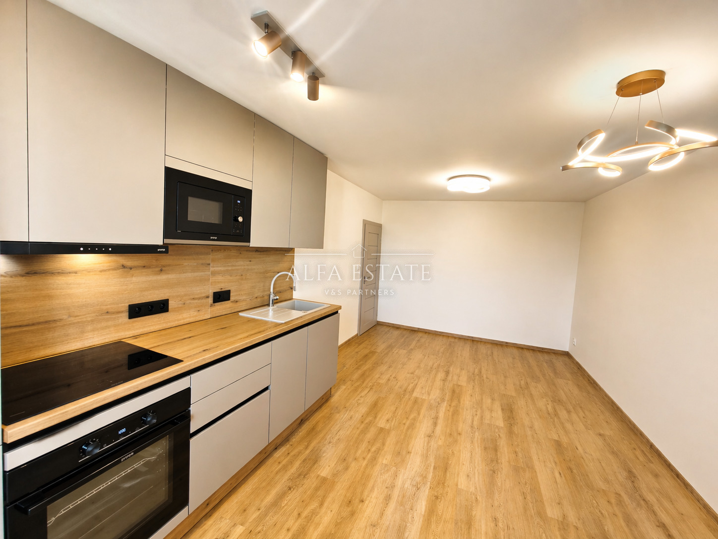 Srdcem bytu je moderní kuchyňská linka vyrobená na míru se spotřebiči značky Gorenje, která elegantně navazuje na obývací část a vytváří otevřený, vzdušný a příjemný obytný prostor. Ve stejném kvalitativním standardu byla zhotovena také prostorná vestavěná skříň v předsíni, rovněž značky Gorenje. Koupelna byla navržena s důrazem na estetiku i praktičnost a nabízí prostorný sprchový kout o velikosti 120 cm i citlivě řešený prostor pro pračku a sušičku.