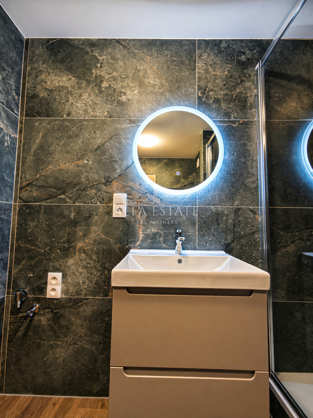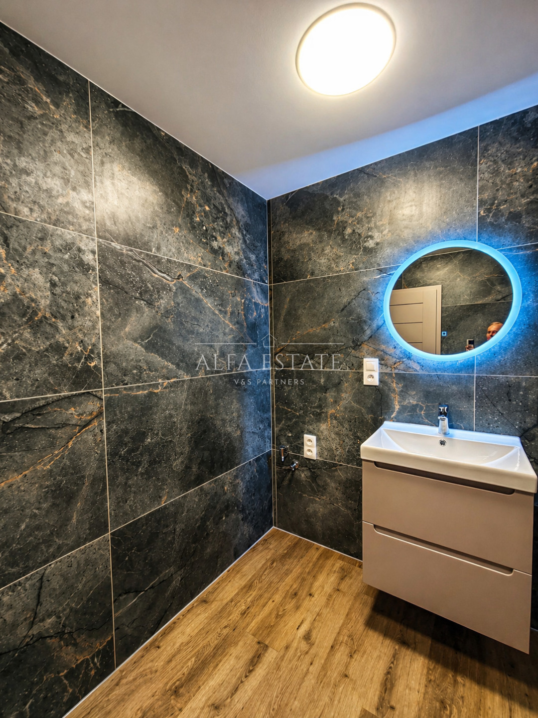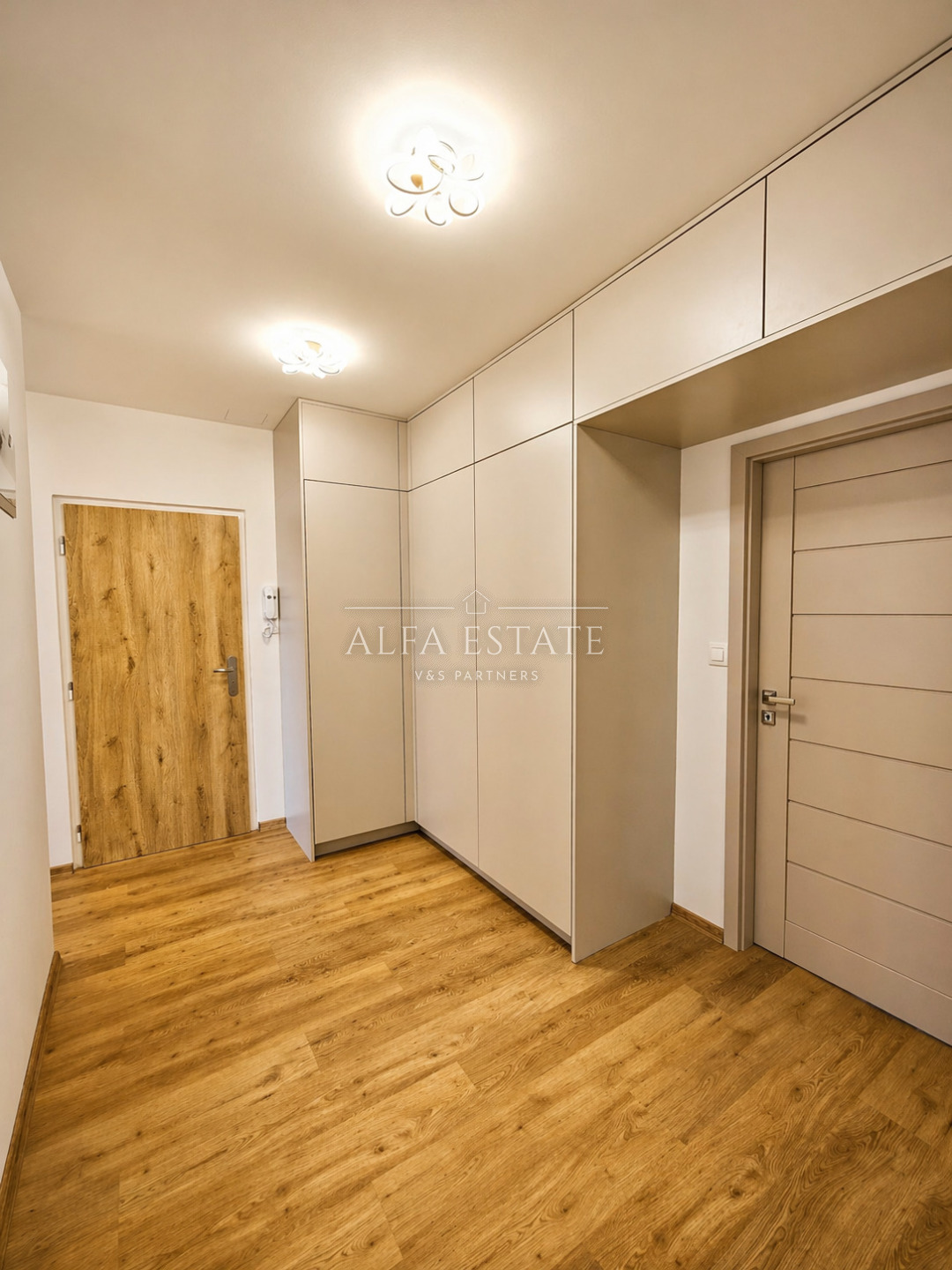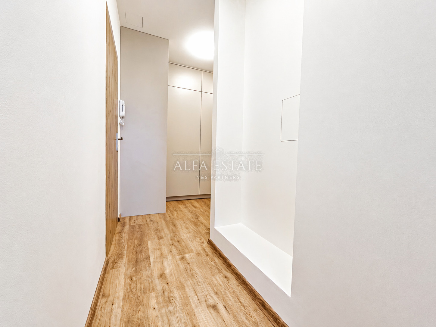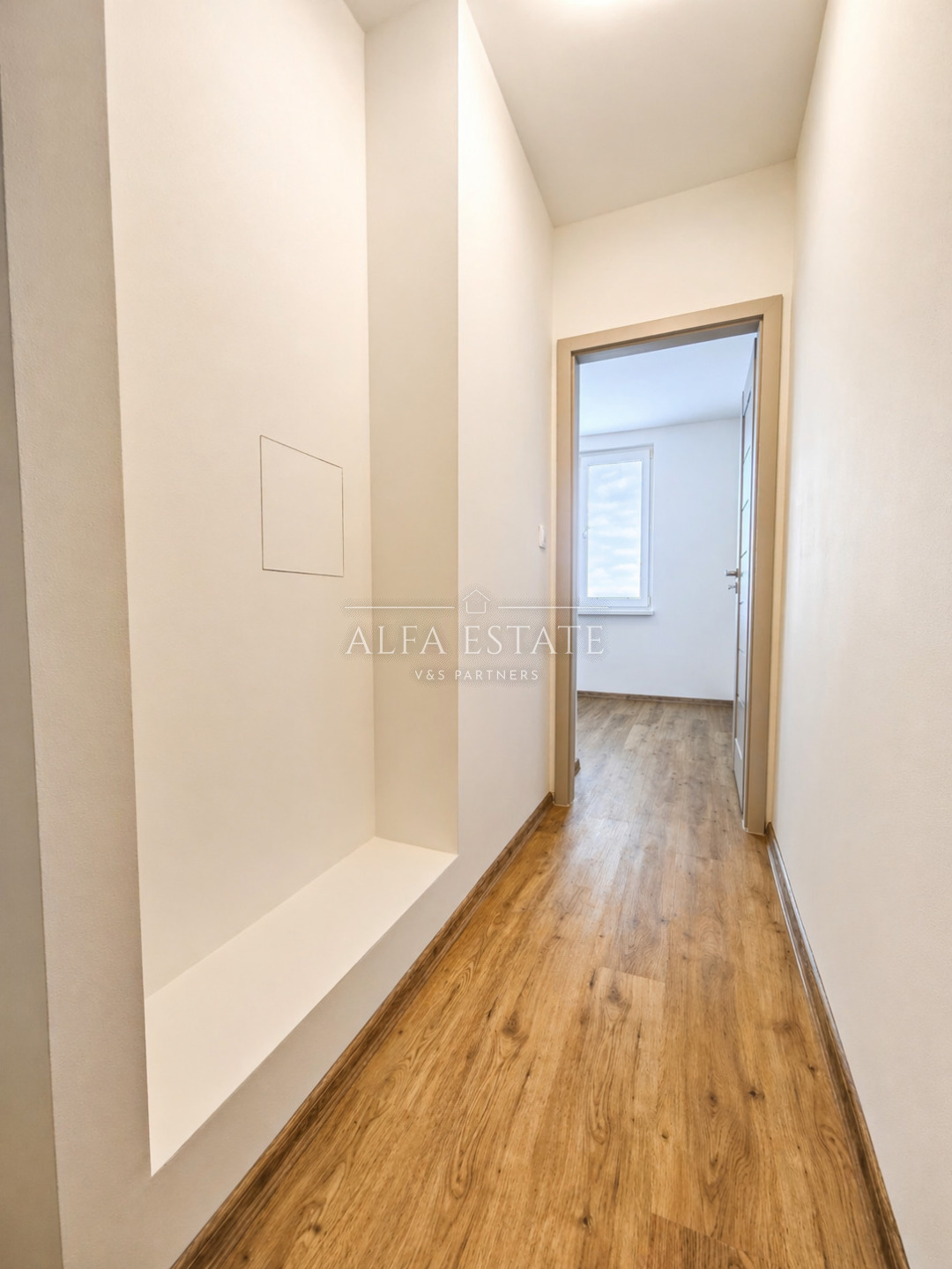 V rámci kompletní renovace byly provedeny zcela nové elektro rozvody, rozvody vody, nové štuky, snížené SDK podhledy, nivelační stěrky s kvalitní vinylovou krytinou a instalovány nové obložkové zárubně s interiérovými dveřmi značky Sapeli. Celý interiér působí nadčasově, harmonicky a velmi vkusně.