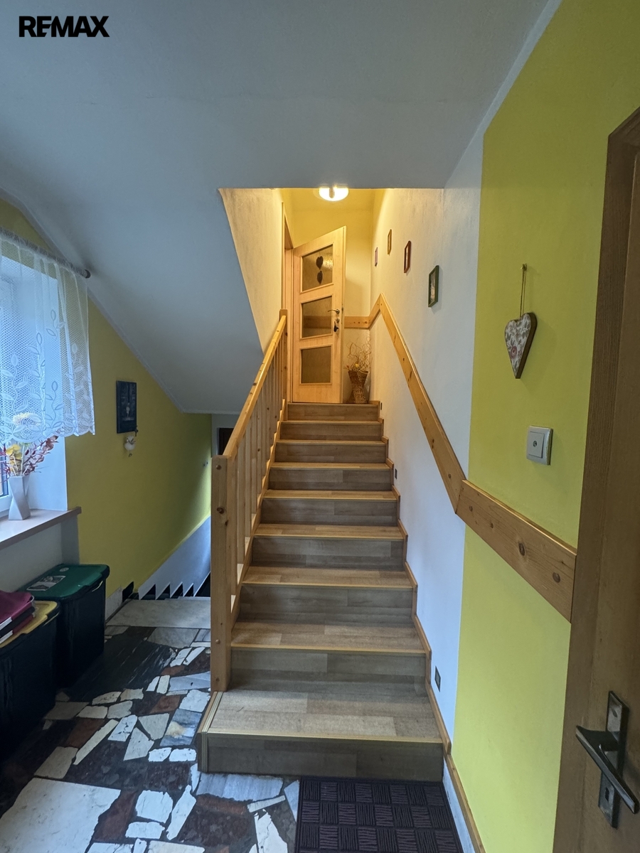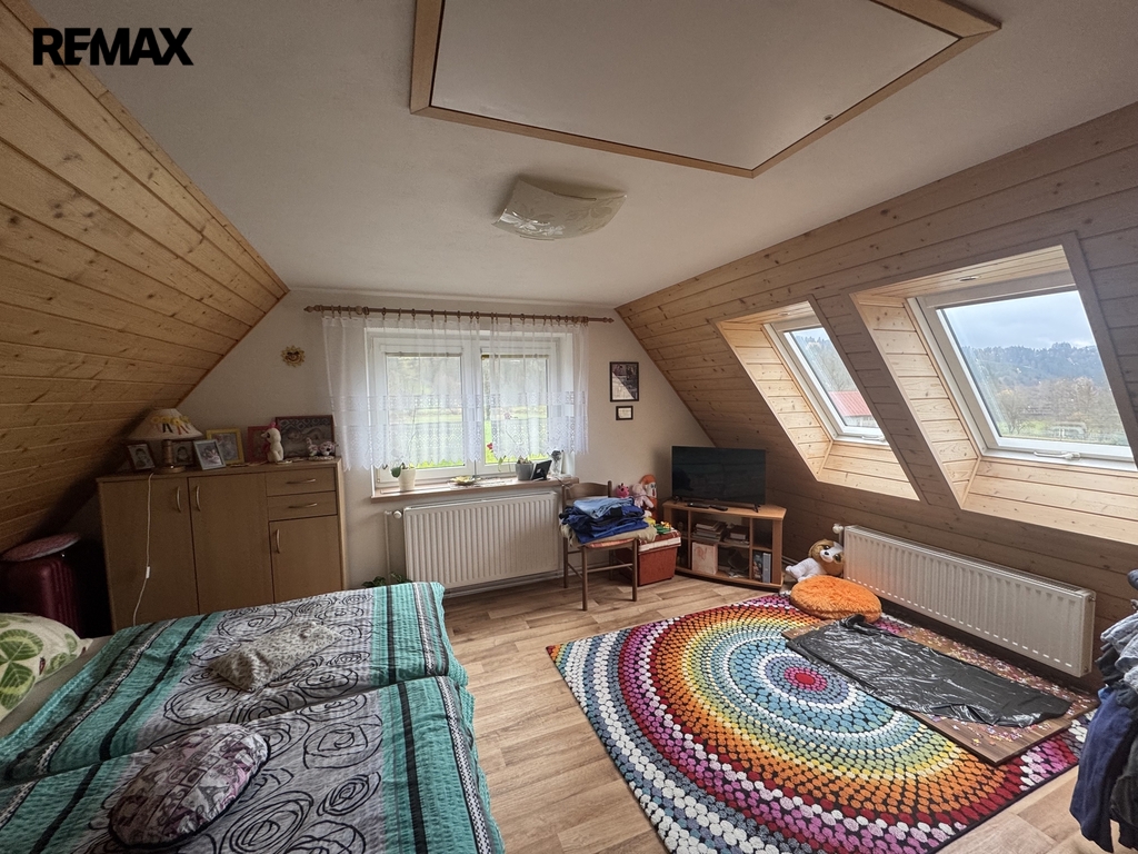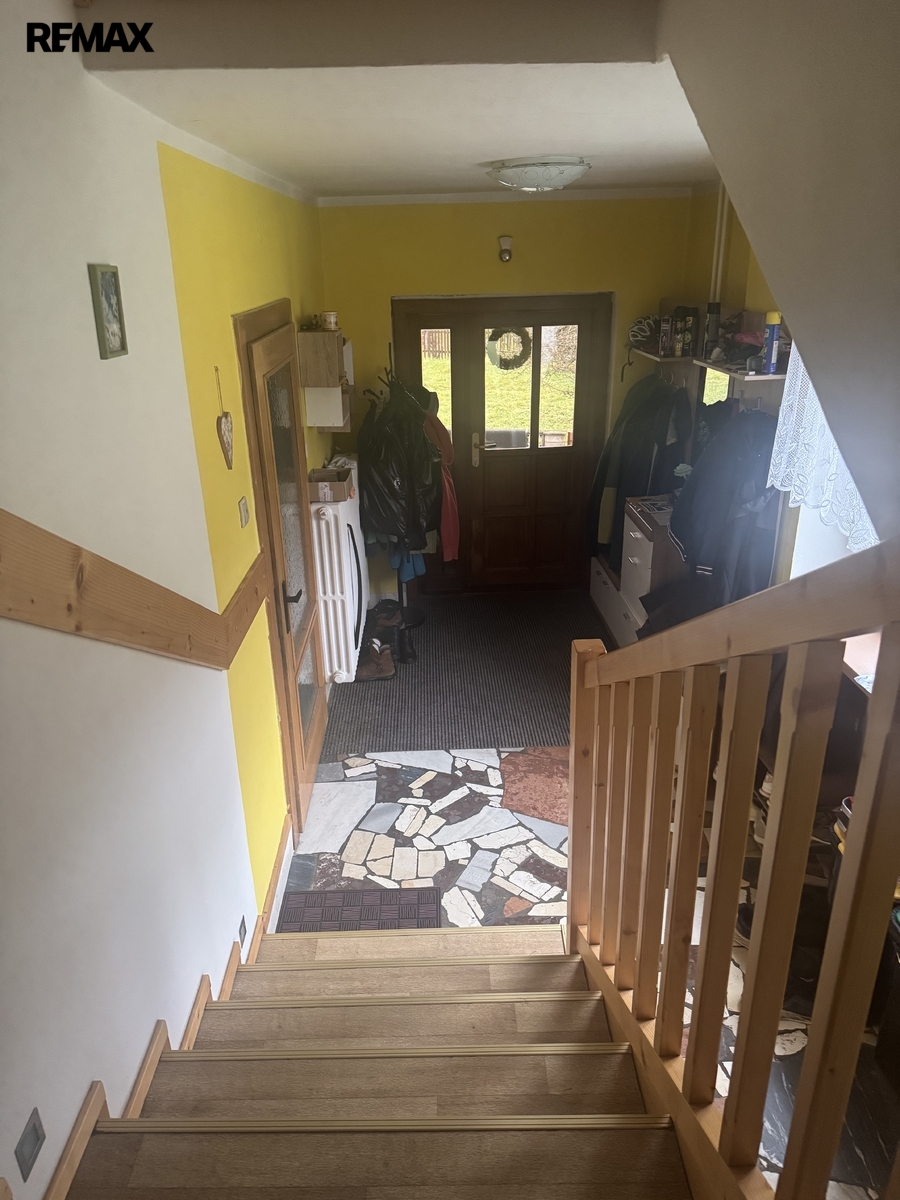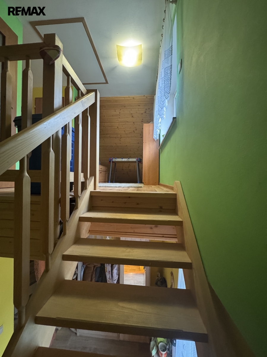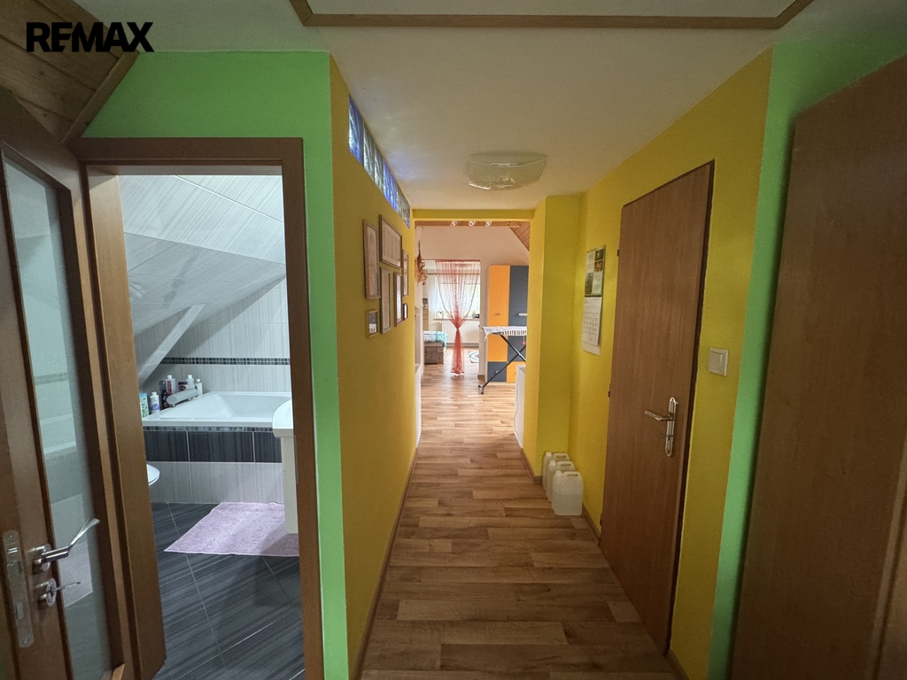 Po schodišti ze zádveří se dostaneme do patra, kde se nachází druhá bytová jednotka 3+1. Ta již prošla rekonstrukcí a nabízí komfortní bydlení s prostornou koupelnou vybavenou vanou i sprchovým koutem.