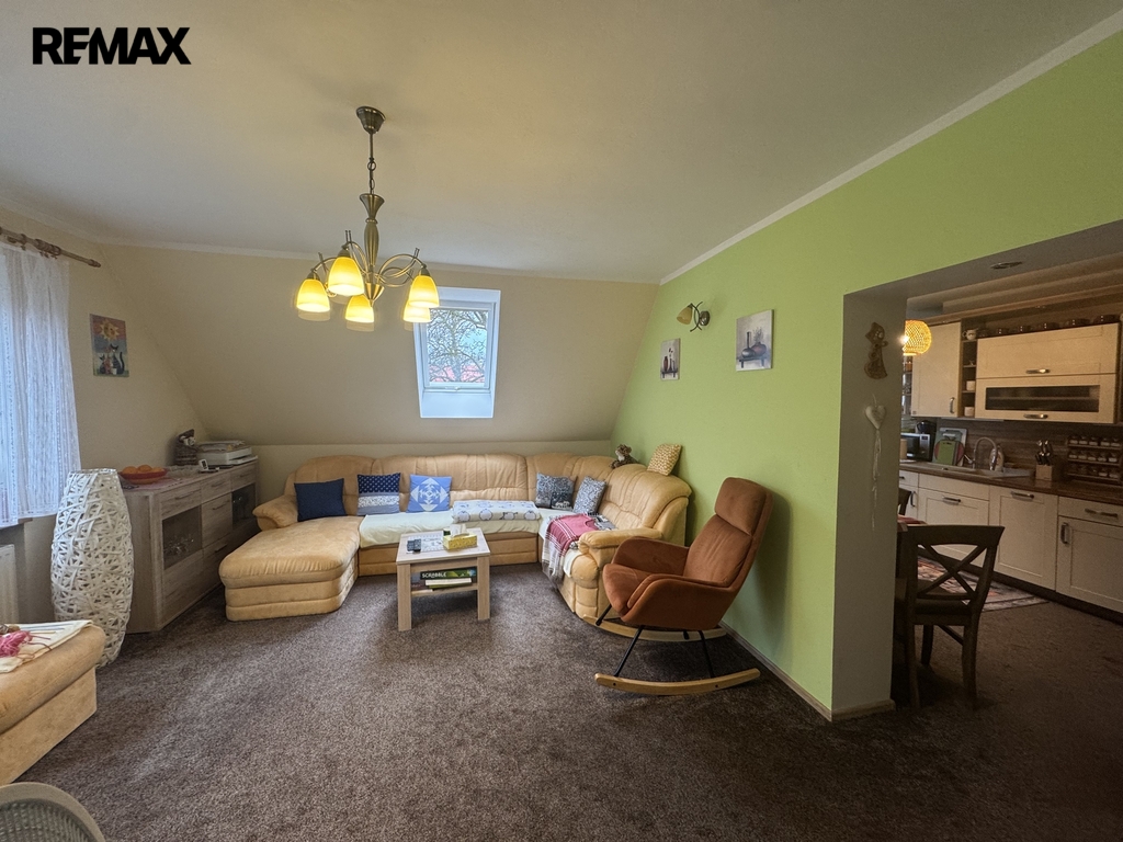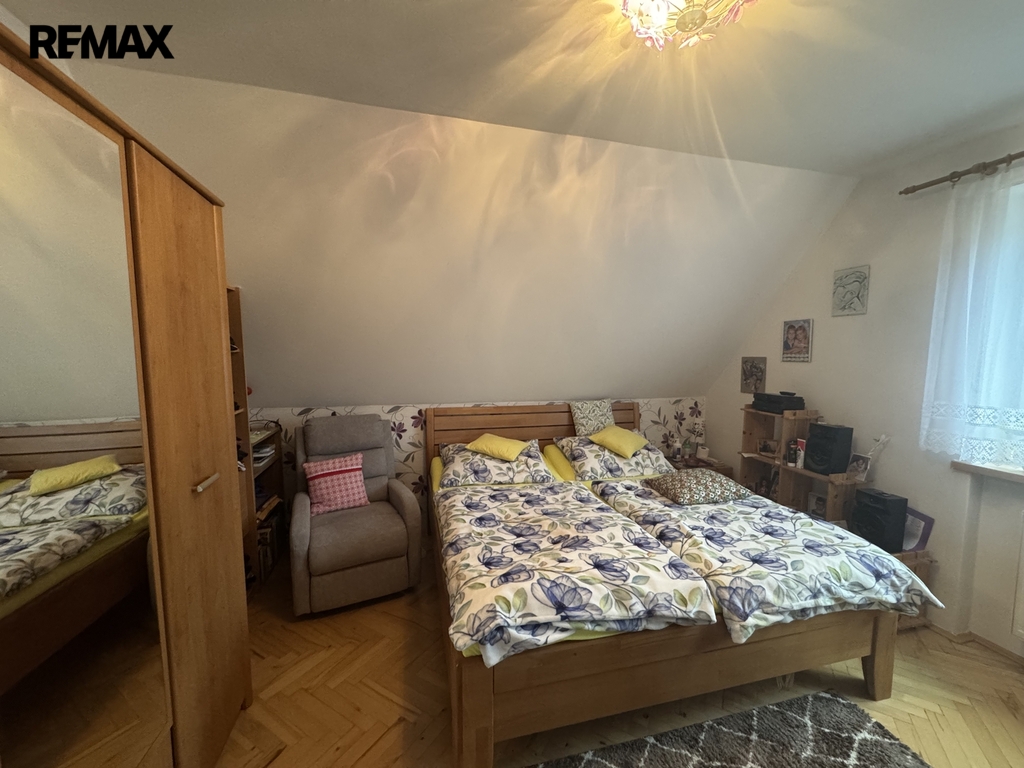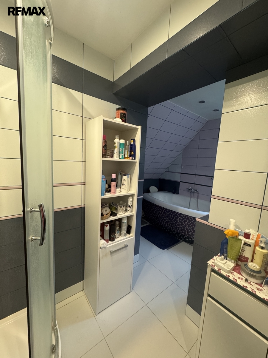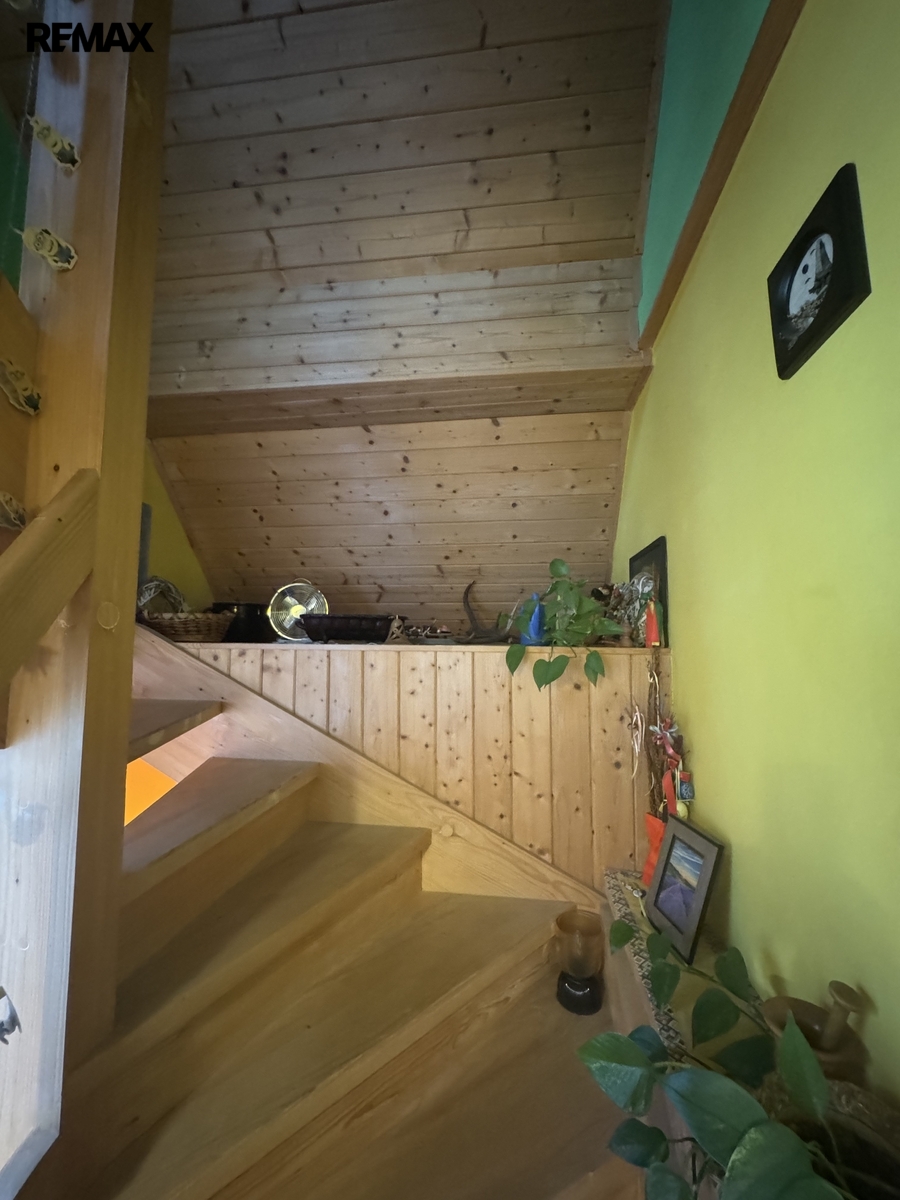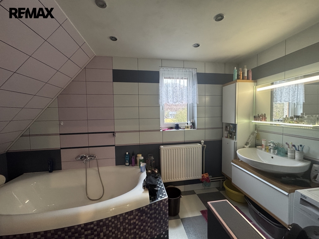 Po schodišti ze zádveří se dostaneme do patra, kde se nachází druhá bytová jednotka 3+1. Ta již prošla rekonstrukcí a nabízí komfortní bydlení s prostornou koupelnou vybavenou vanou i sprchovým koutem.