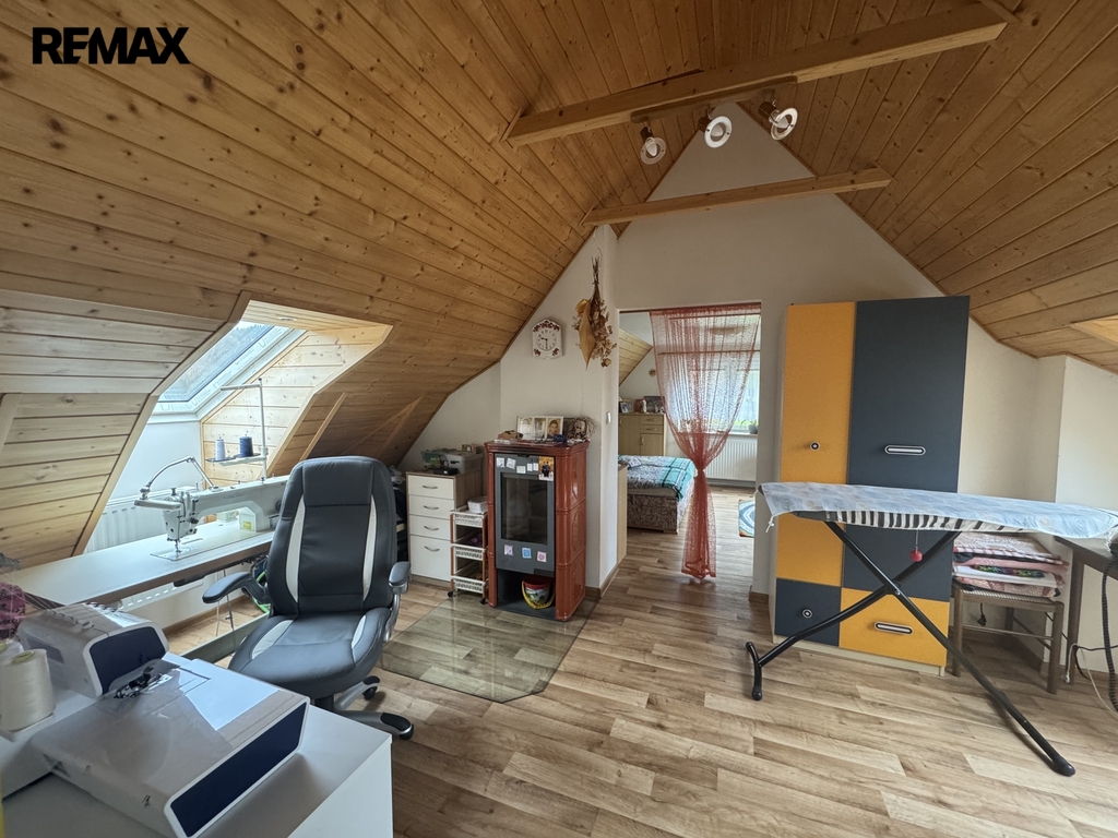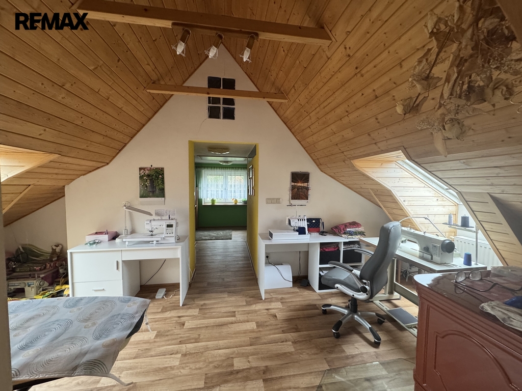 Z patra pokračuje schodiště do podkroví, které může sloužit jako pracovna, ateliér, pokoj pro hosty či jiné volnočasové využití. V této části je k dispozici koupelna s WC a dva otevřené, světlé podkrovní prostory se střešními okny.