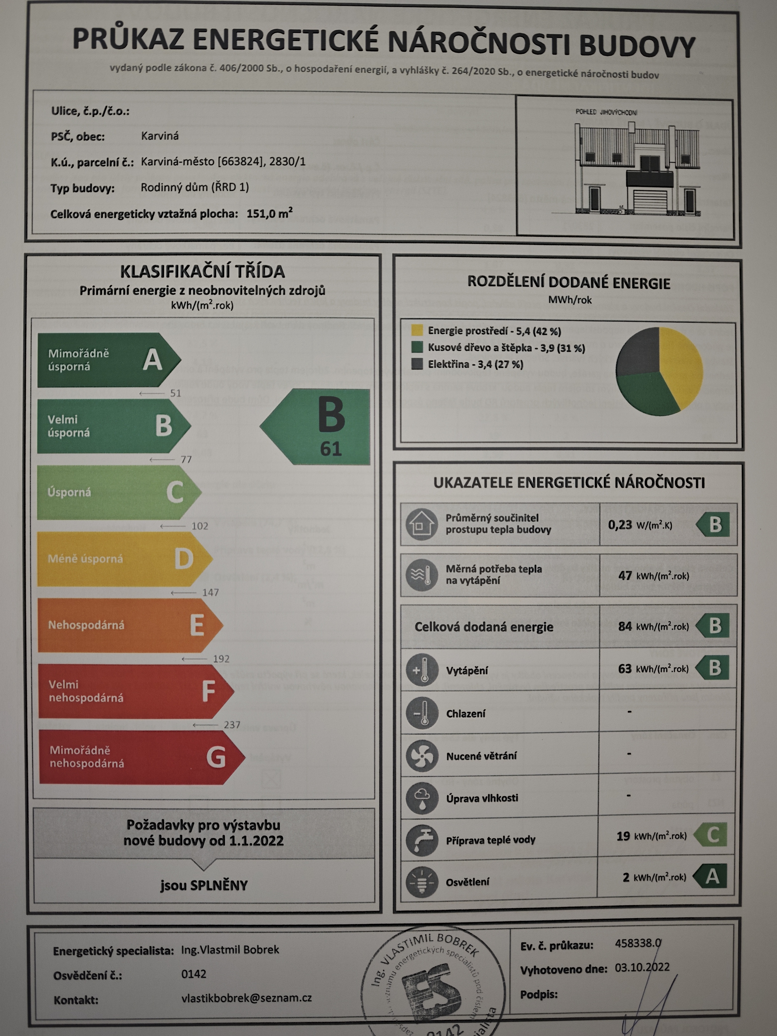 - Ukazatel energetické náročnosti budovy: 61 kWh/m²