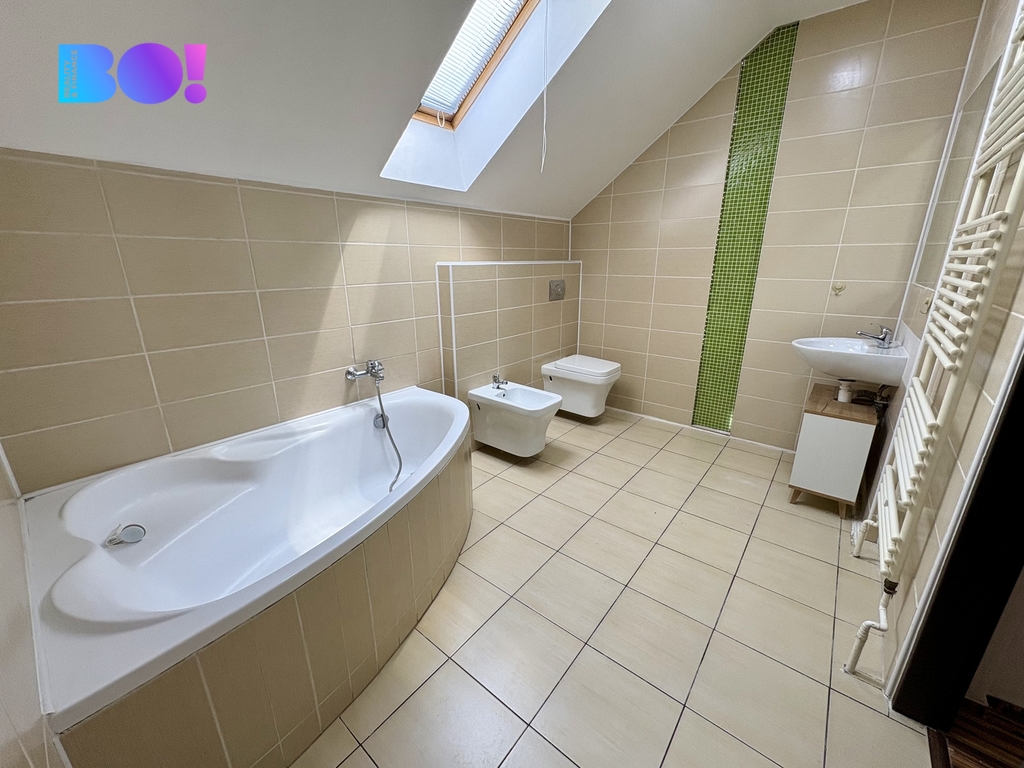 Dispozice prostor zahrnuje vstupní chodbu, sociální zázemí s koupelnou (vana), samostatné WC a bidet, dále dvě oddělené kanceláře a prostornou hlavní kancelář s kuchyňským koutem, která je ideální jako open space, zasedací místnost či hlavní pracovní prostor. Podkrovní charakter dodává interiéru osobitý styl a příjemné pracovní prostředí, přičemž celková plocha nabízí dostatek prostoru pro menší firmu, administrativní zázemí či poradenské služby.