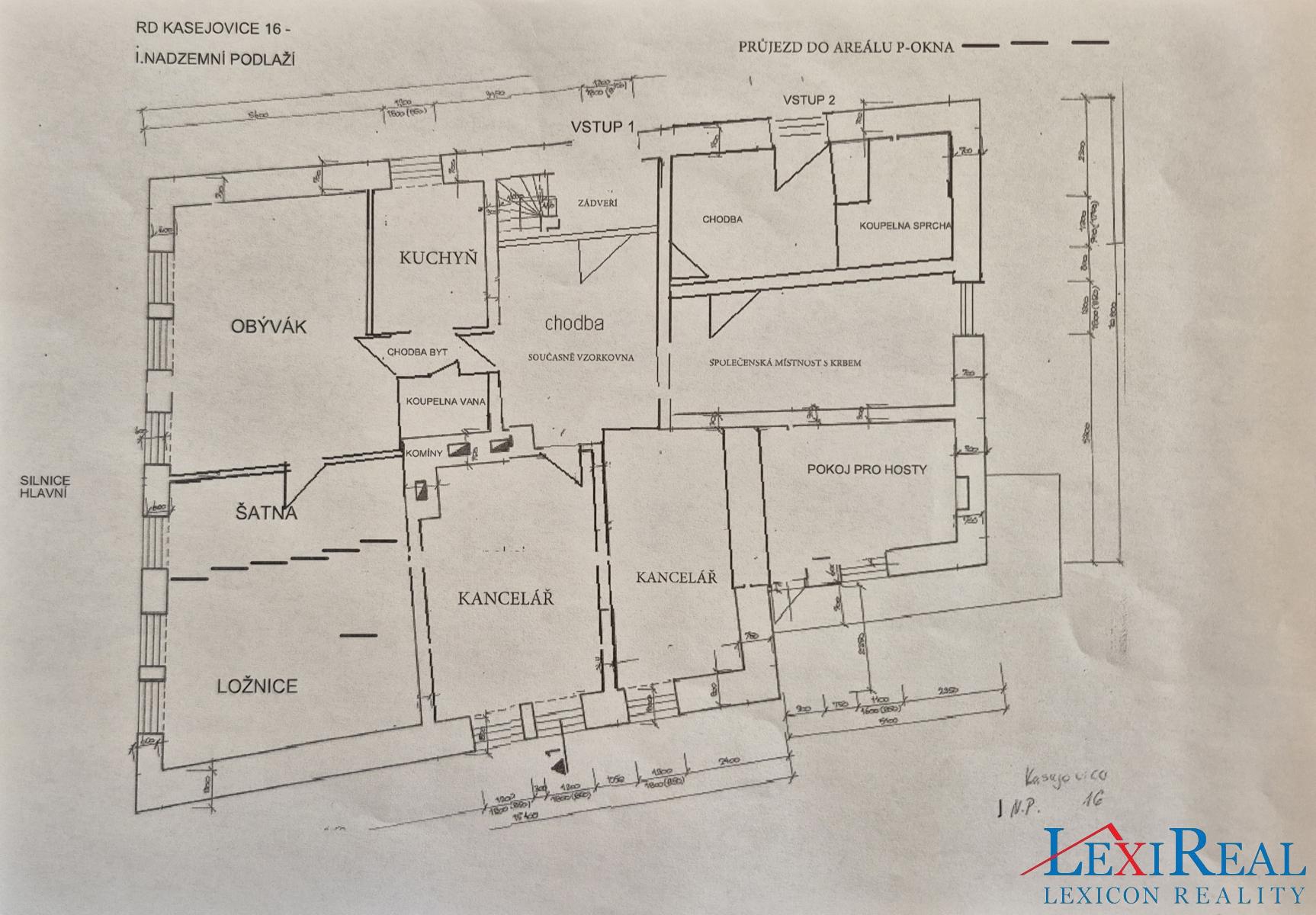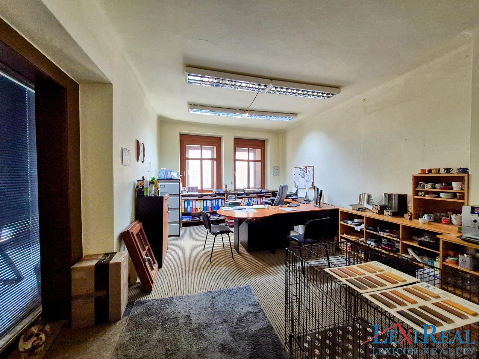 1. podlaží (160 m2 byt 6+1 s 2 koupelnami, propojený s kancelářskými a společenskými prostory (cca 70 m2). Možnost přizpůsobení dle potřeb nového majitele.
