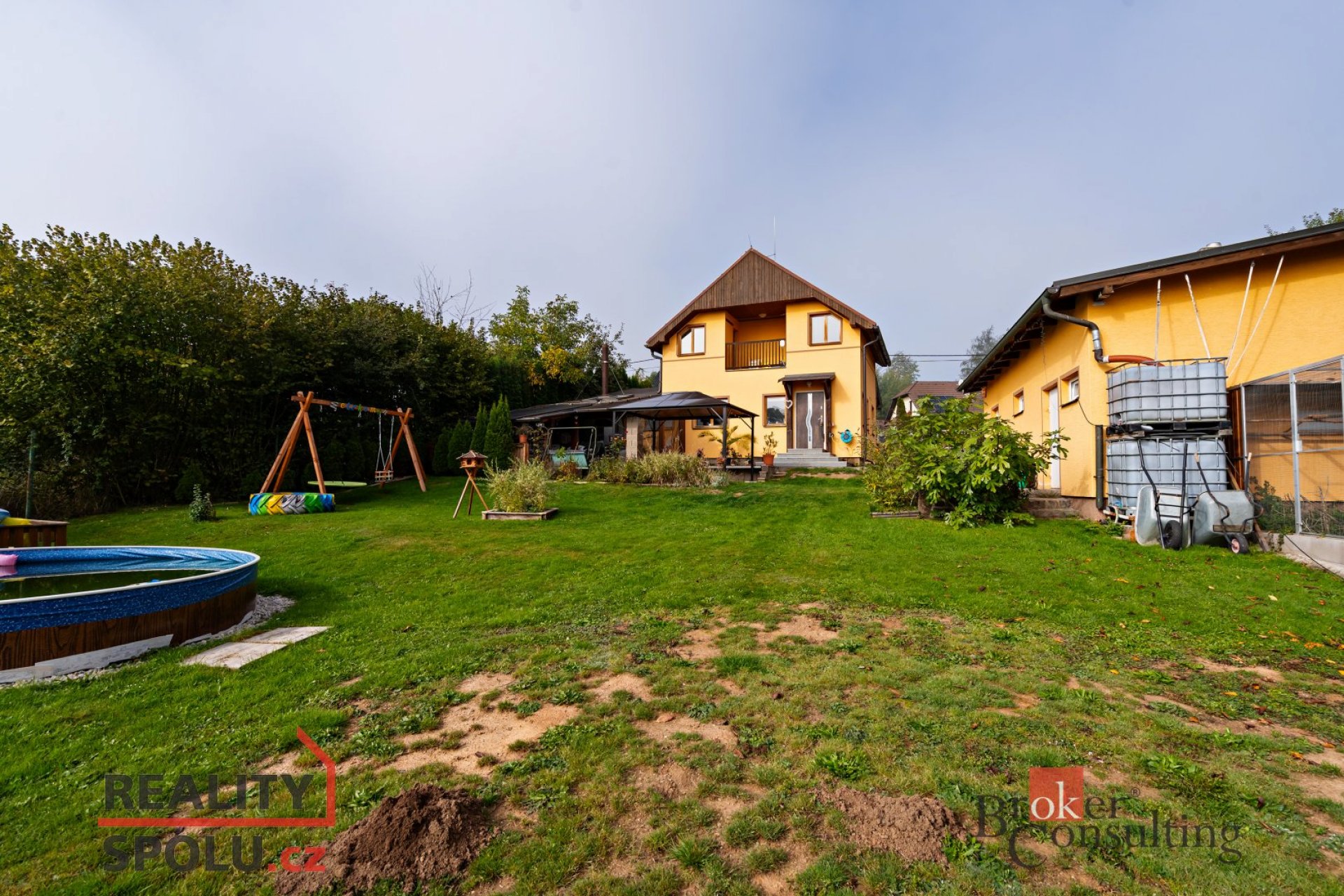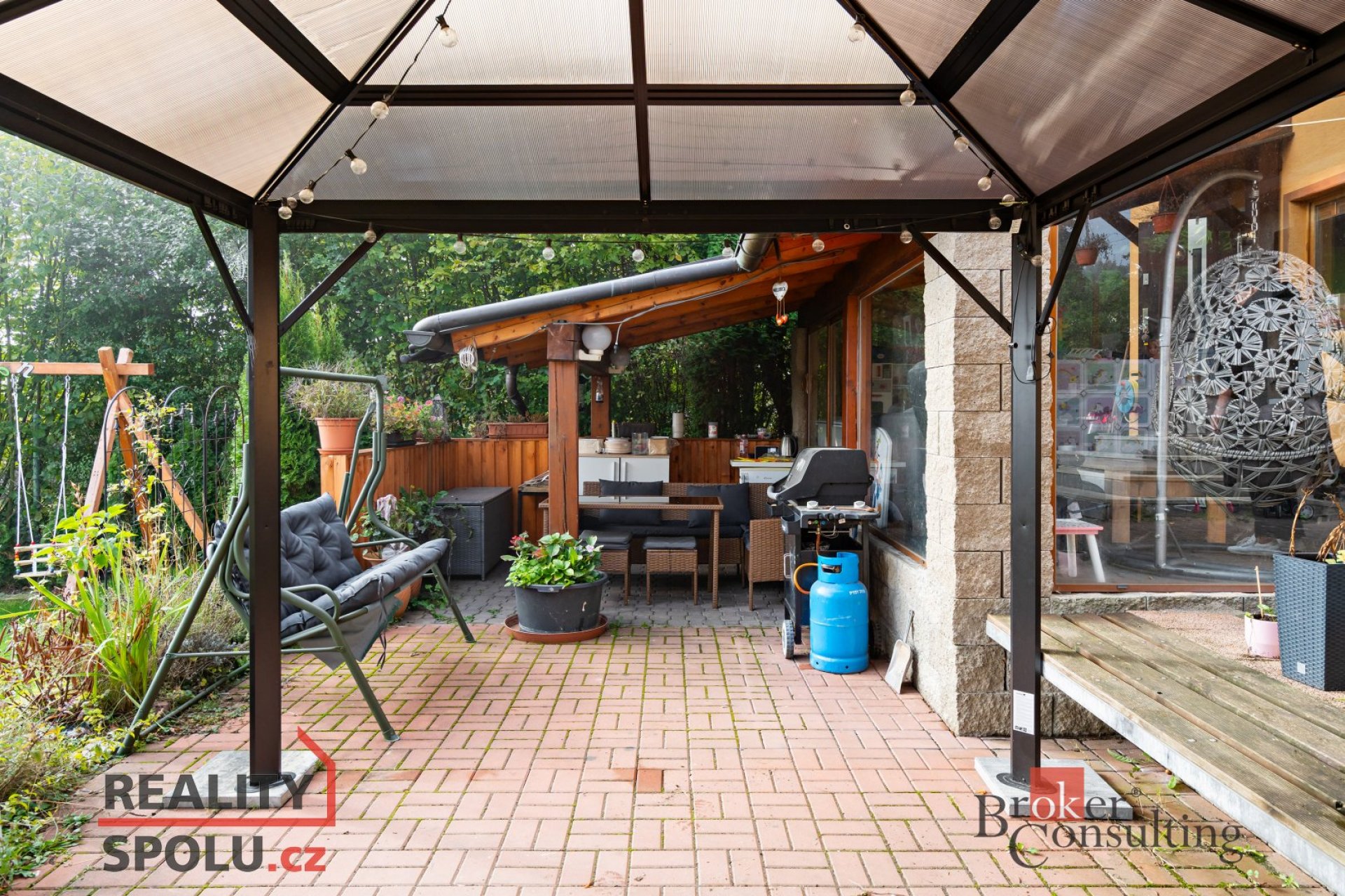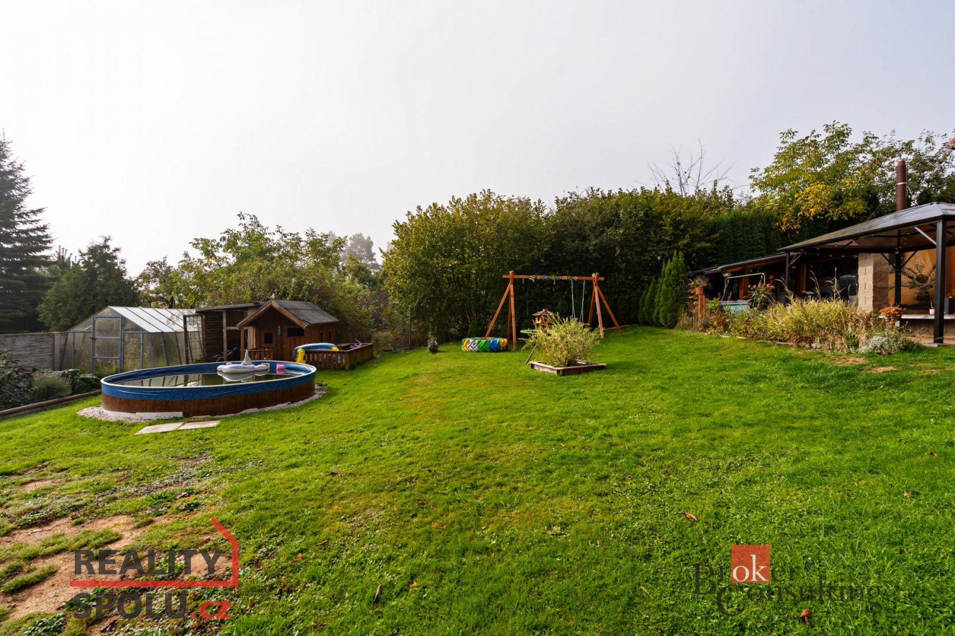 Na zimní zahradu je napojena pergola s nádherným výhledem na krajinu a okrasnou zahradu s jezírkem. Na zahradě je bazén a dřevěná chatička, dostatek prostoru pro venkovní aktivity ,odpočinek.