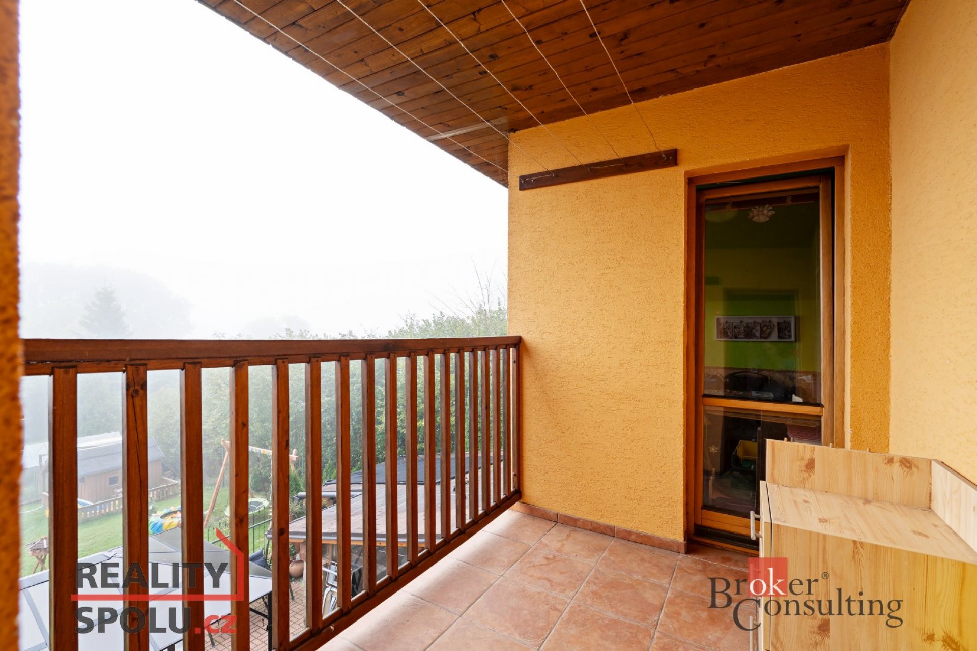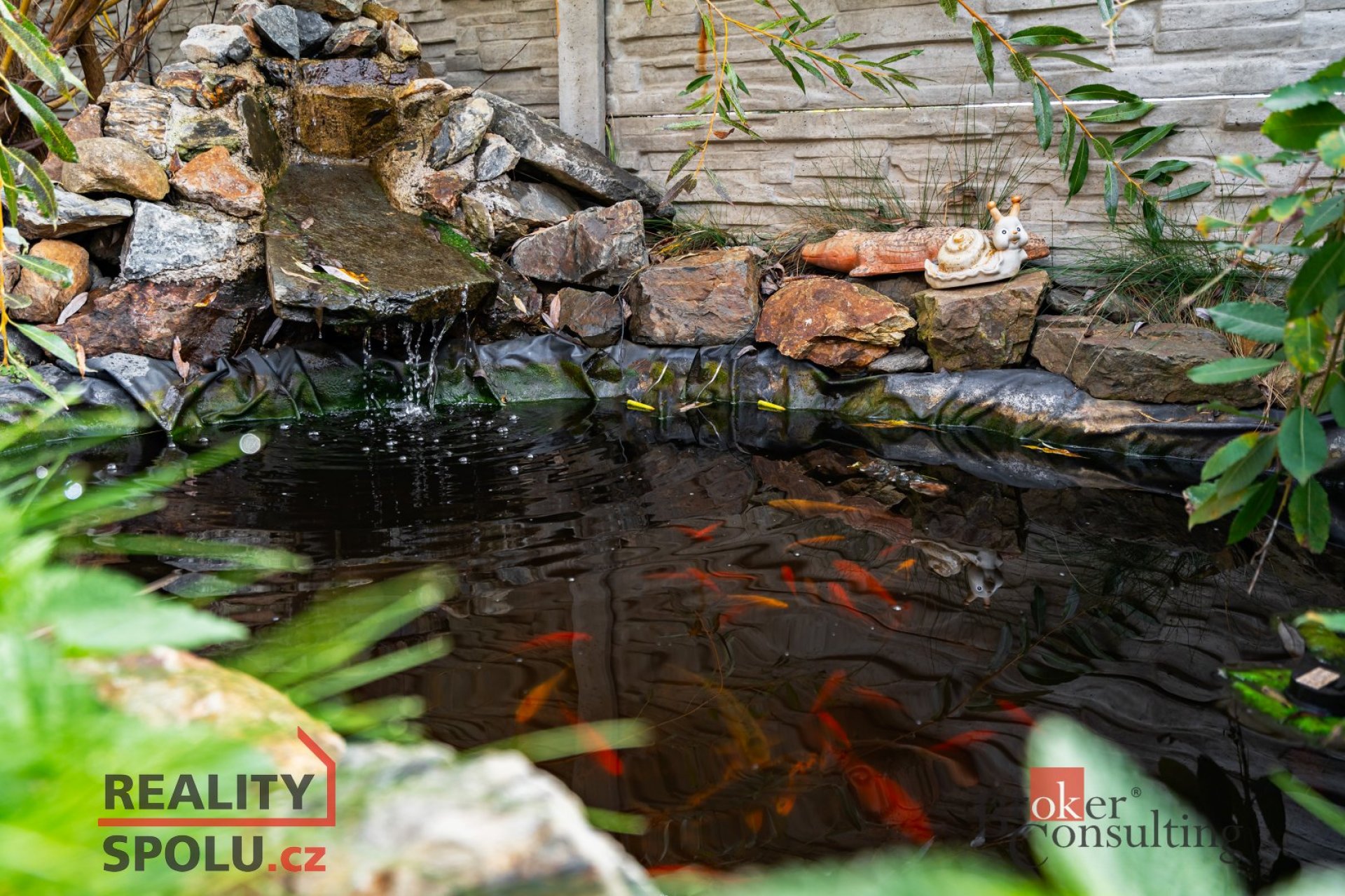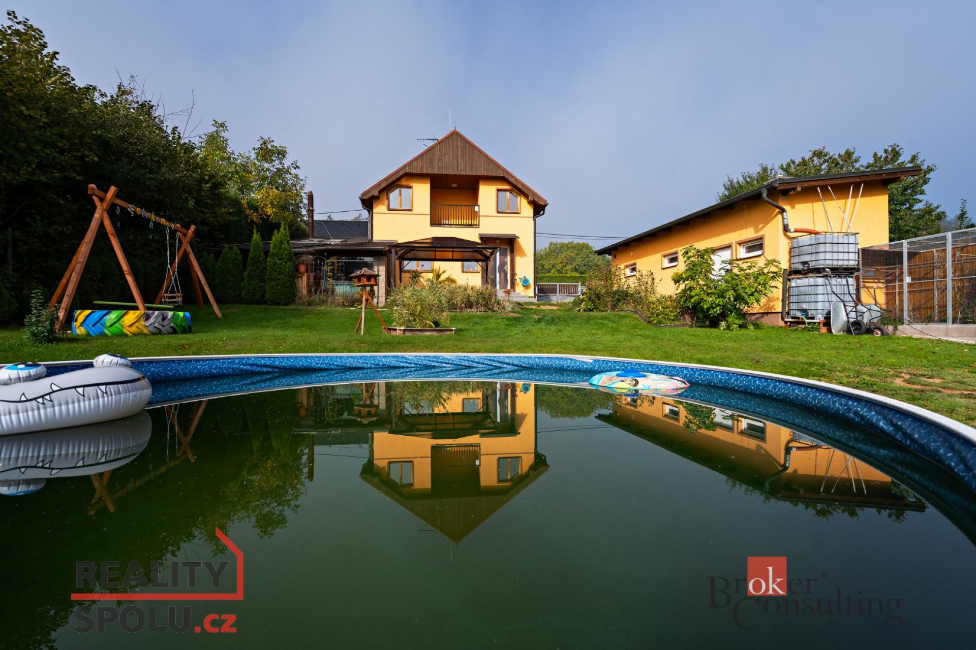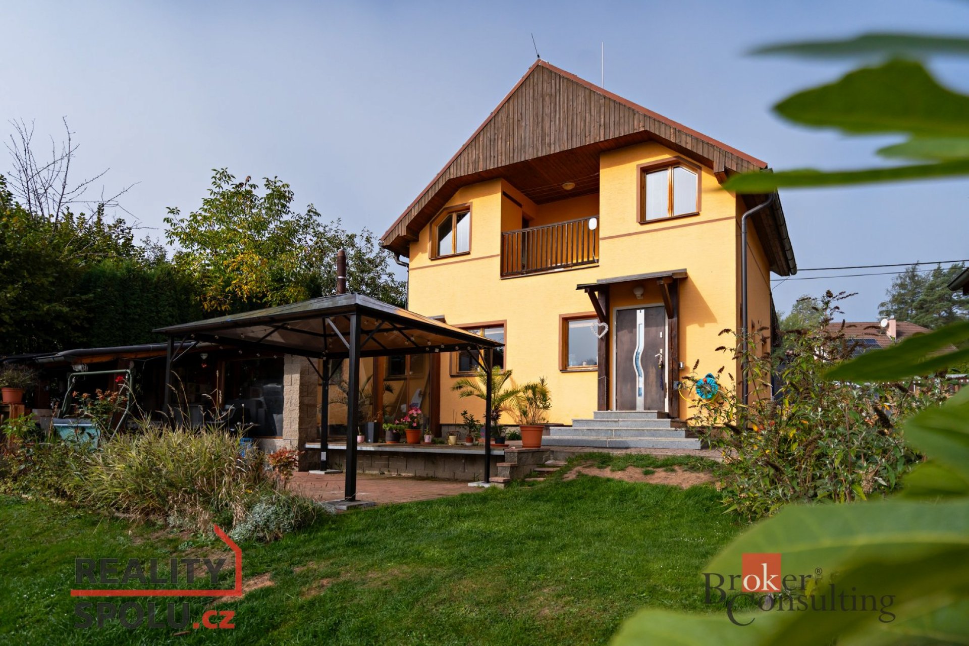 Na zimní zahradu je napojena pergola s nádherným výhledem na krajinu a okrasnou zahradu s jezírkem. Na zahradě je bazén a dřevěná chatička, dostatek prostoru pro venkovní aktivity ,odpočinek.