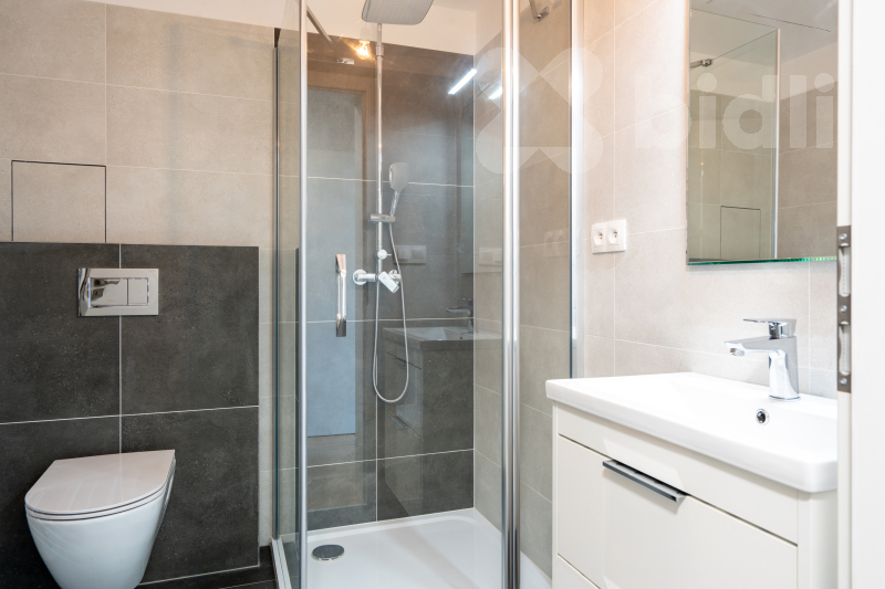 Koupelna (3,9 m2) se sprchovým koutem, s otopným žebříkem, s místem pro pračku a s toaletou.