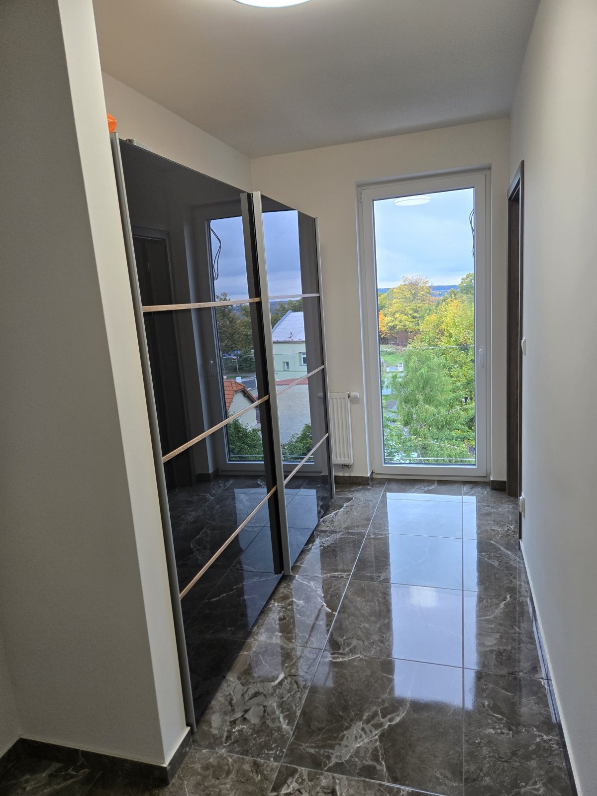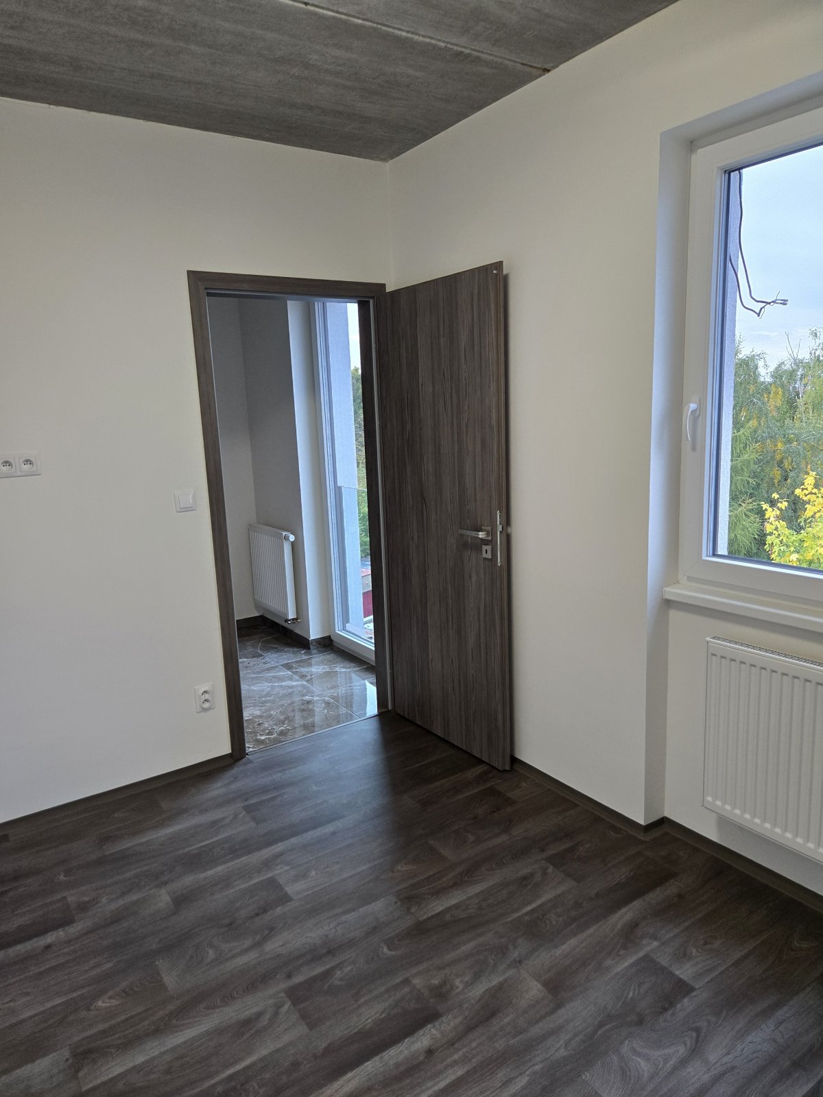 Moderní trendy bydlení - vinylové podlahy, přiznané betonové stropy, designové interiérové dveře, moderní svítidla, mramorové obložení koupelny, optické datové kabely, okenní trojskla.