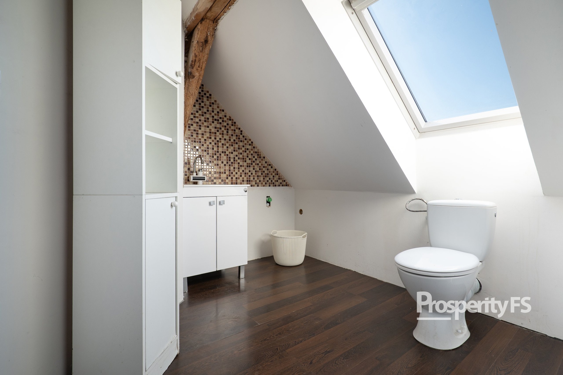 * V patře jsou umístěny 3 pokoje (ložnice a dva dětské pokoje), hala s krbem a koupelna s toaletou