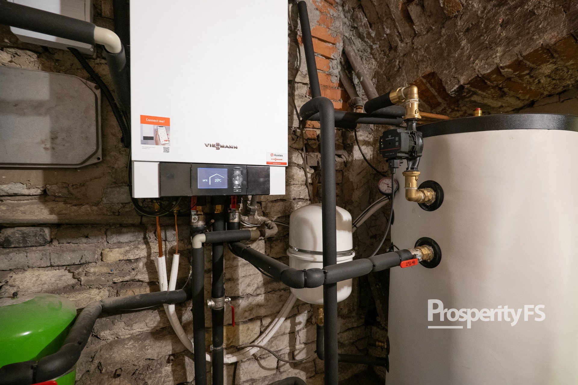 * Tepelné čerpadlo zajišťuje vytápění a ohřev vody v 300litrovém bojleru, přičemž solární panely produkují elektřinu pro domácnost a ohřev vody