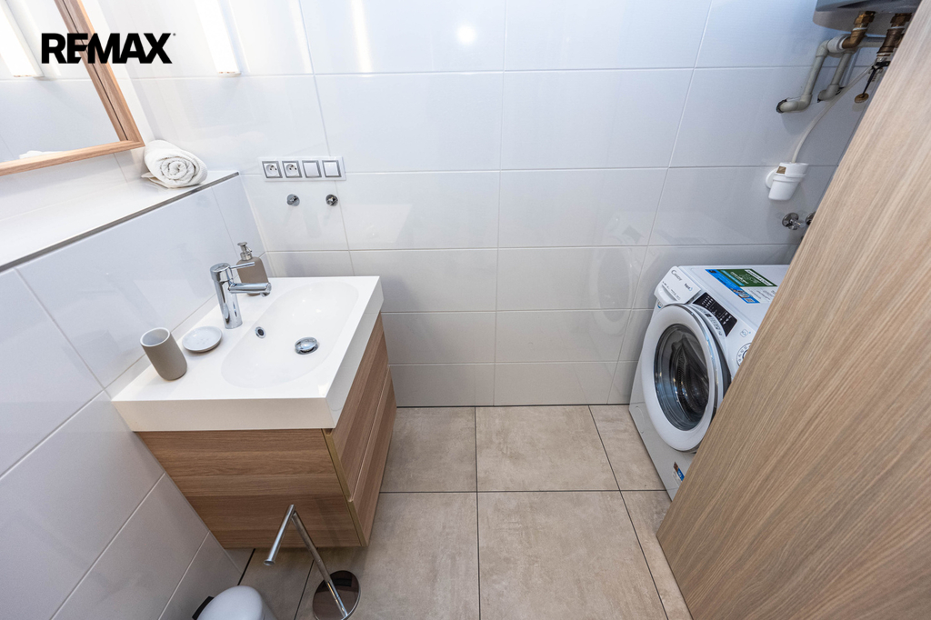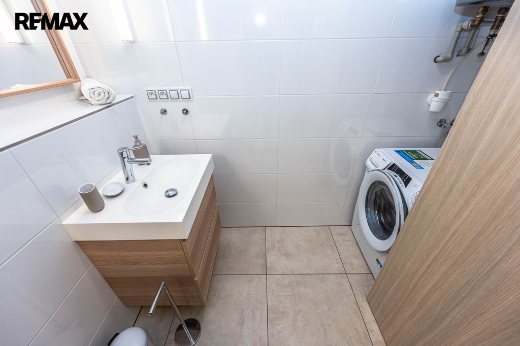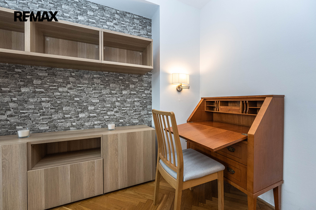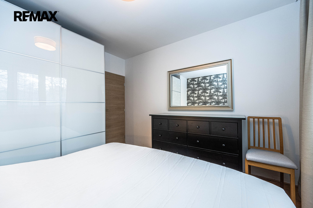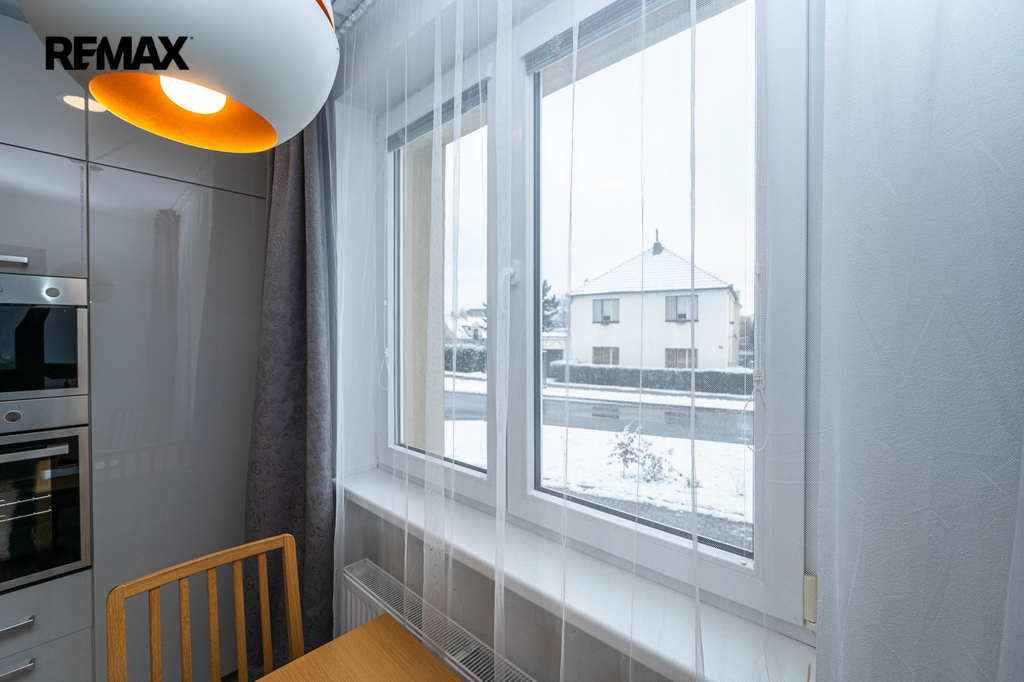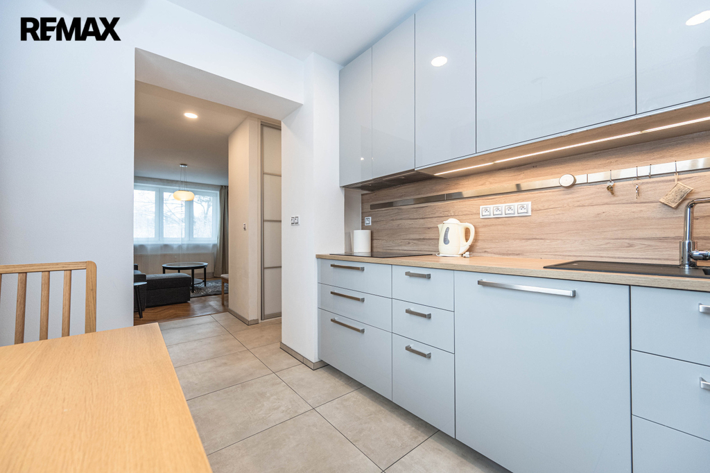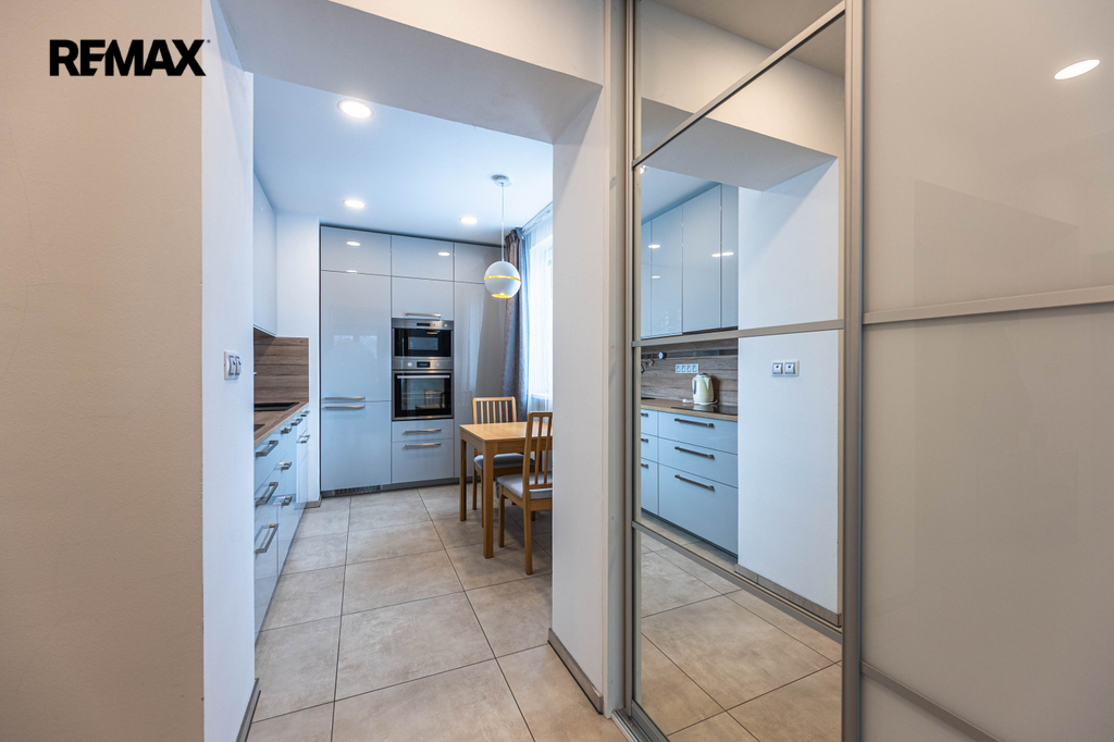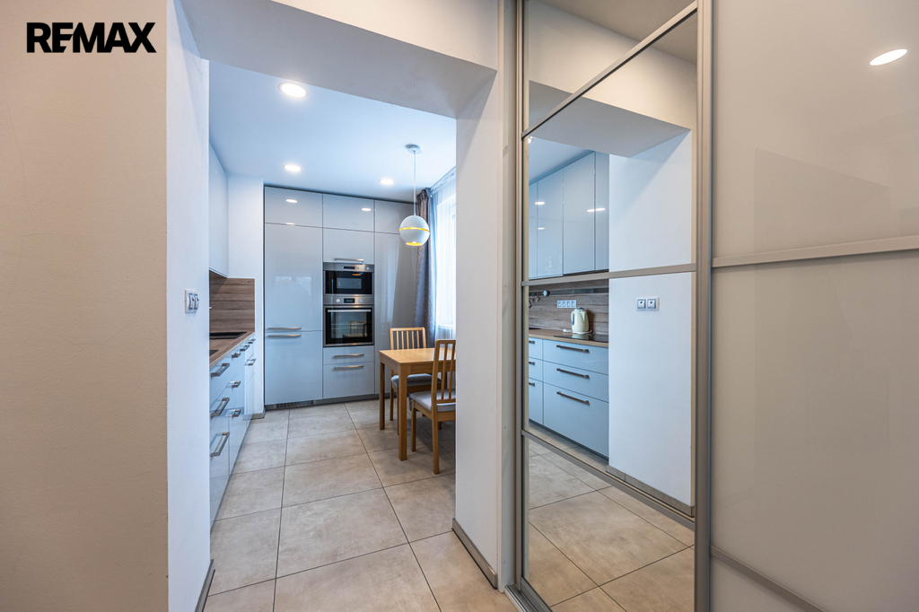 Kuchyň je plně vybavená a to včetně indukční desky, trouby, mikrovlnky, myčky na nádobí a lednice. V bytě zůstává veškerý nábytek na fotografiích.