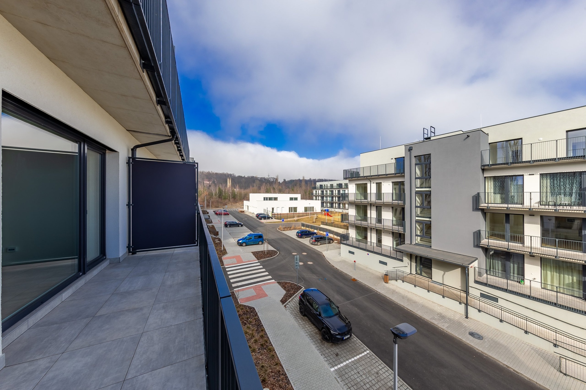Byt je orientován na východ a disponuje prostorným balkonem se vstupem z obývacího pokoje i ložnice, což zajišťuje dostatek ranního světla a příjemnou atmosféru.