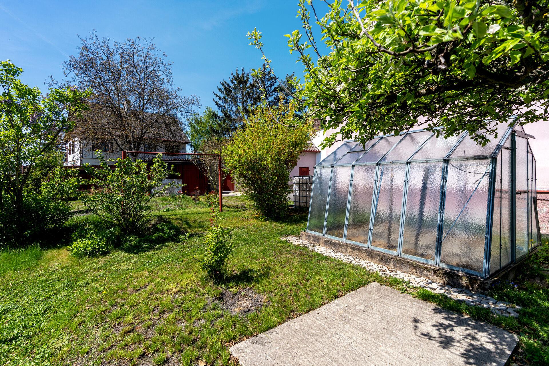 Zahrada poskytuje soukromí a spoustu možností – sousední domy mají okna orientována na opačné strany a přímý soused je pouze na jedné, jižní straně. Severní část pozemku je ideální pro již zmiňovanou výstavbu přístřešku pro auto nebo garáže, kterou lze propojit s domem přes technickou místnost. Najdete zde také starší zahradní domek, skleník a dvě menší komory (jedna dříve sloužila jako sklad uhlí) a připravené záhonky. Vodu na zalévání zajistí nádrž napojená na svod z okapů.