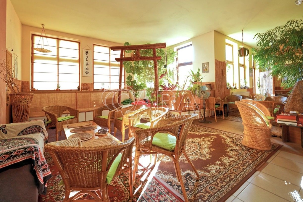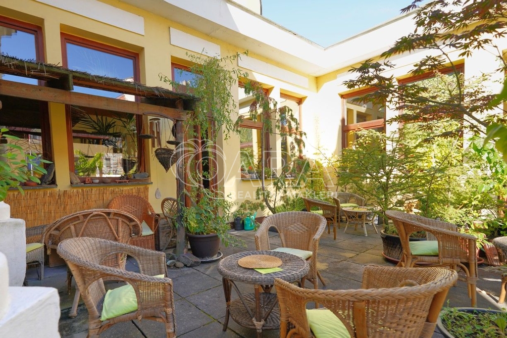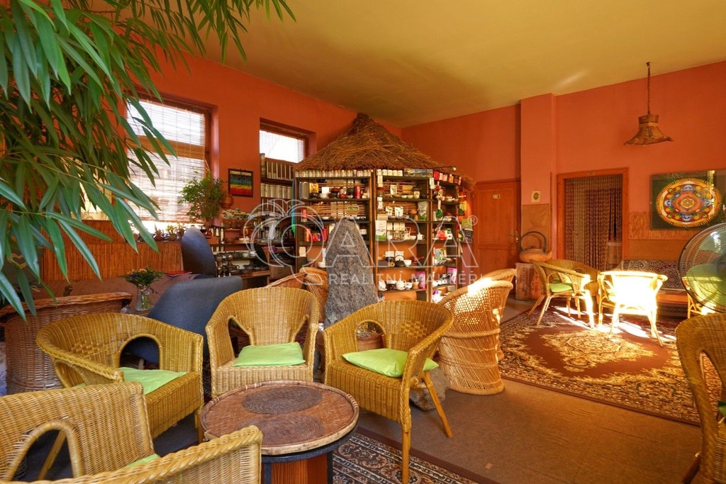 Dům je rozdělen na dvě části. V prvním vchodu se nachází restaurace s potravinami v přízemí. Nad ní je vyhlášená a skvěle hodnocená tradiční čajovna s velkou terasou. V posledním patře je 62 m² byt 2+kk a půda. Ve druhém vchodu je music bar v suterénu, pole gym a 41 m² byt v přízemí. V prvním patře je velký sál s točitým schodištěm do druhého patra s učební a zázemím. Ve druhém patře je i 90 m² byt s dispozicí 3+1. Celkově se jedná přibližně o 1.000 m² s velmi zajímavým uspořádáním.