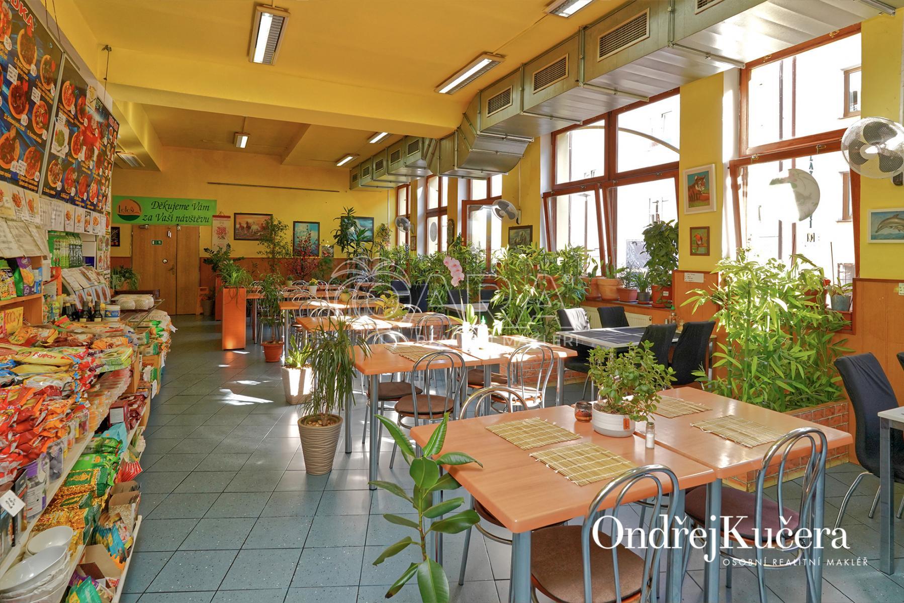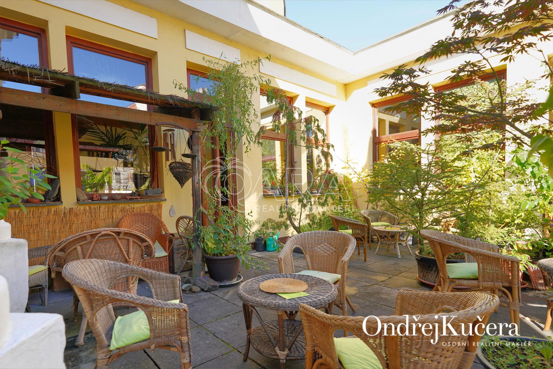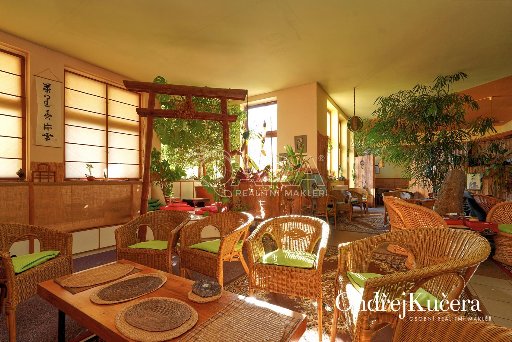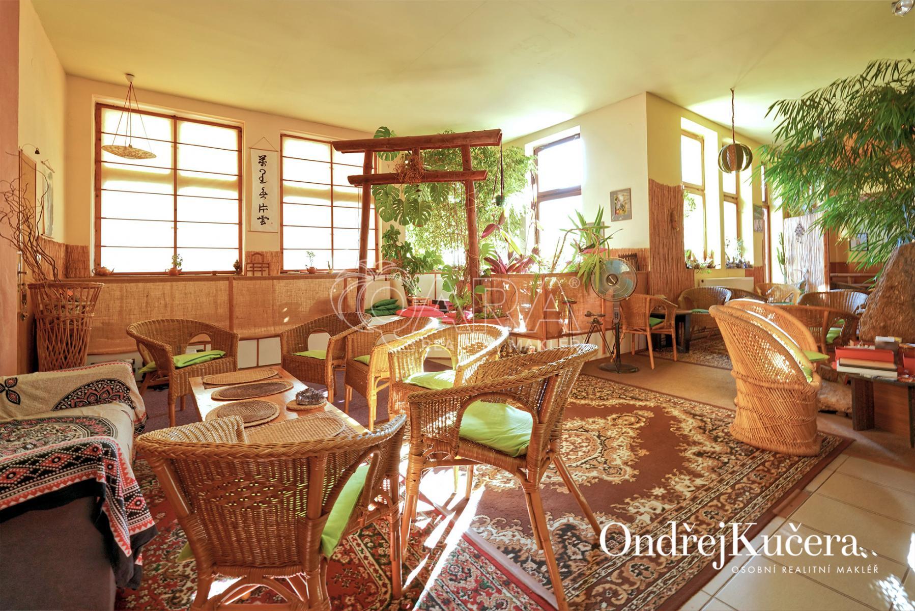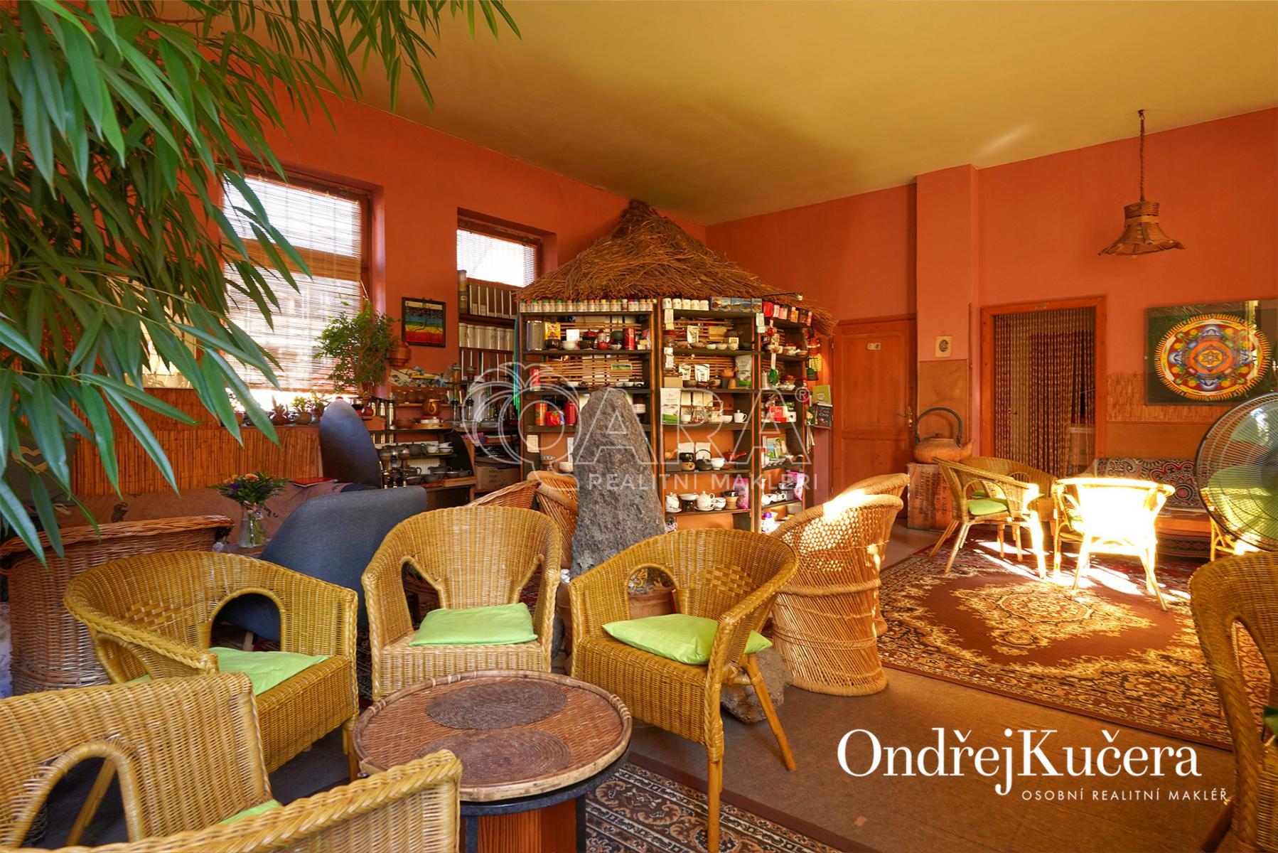 Dům je rozdělen na dvě části. V prvním vchodu se nachází restaurace s potravinami v přízemí. Nad ní je vyhlášená a skvěle hodnocená tradiční čajovna s velkou terasou. V posledním patře je 62 m and sup2; byt 2+kk a půda. Ve druhém vchodu je music bar v suterénu, pole gym a 41 m and sup2; byt v přízemí. V prvním patře je velký sál s točitým schodištěm do druhého patra s učební a zázemím. Ve druhém patře je i 90 m and sup2; byt s dispozicí 3+1. Celkově se jedná přibližně o 1.000 m and sup2; s velmi zajímavým uspořádáním.