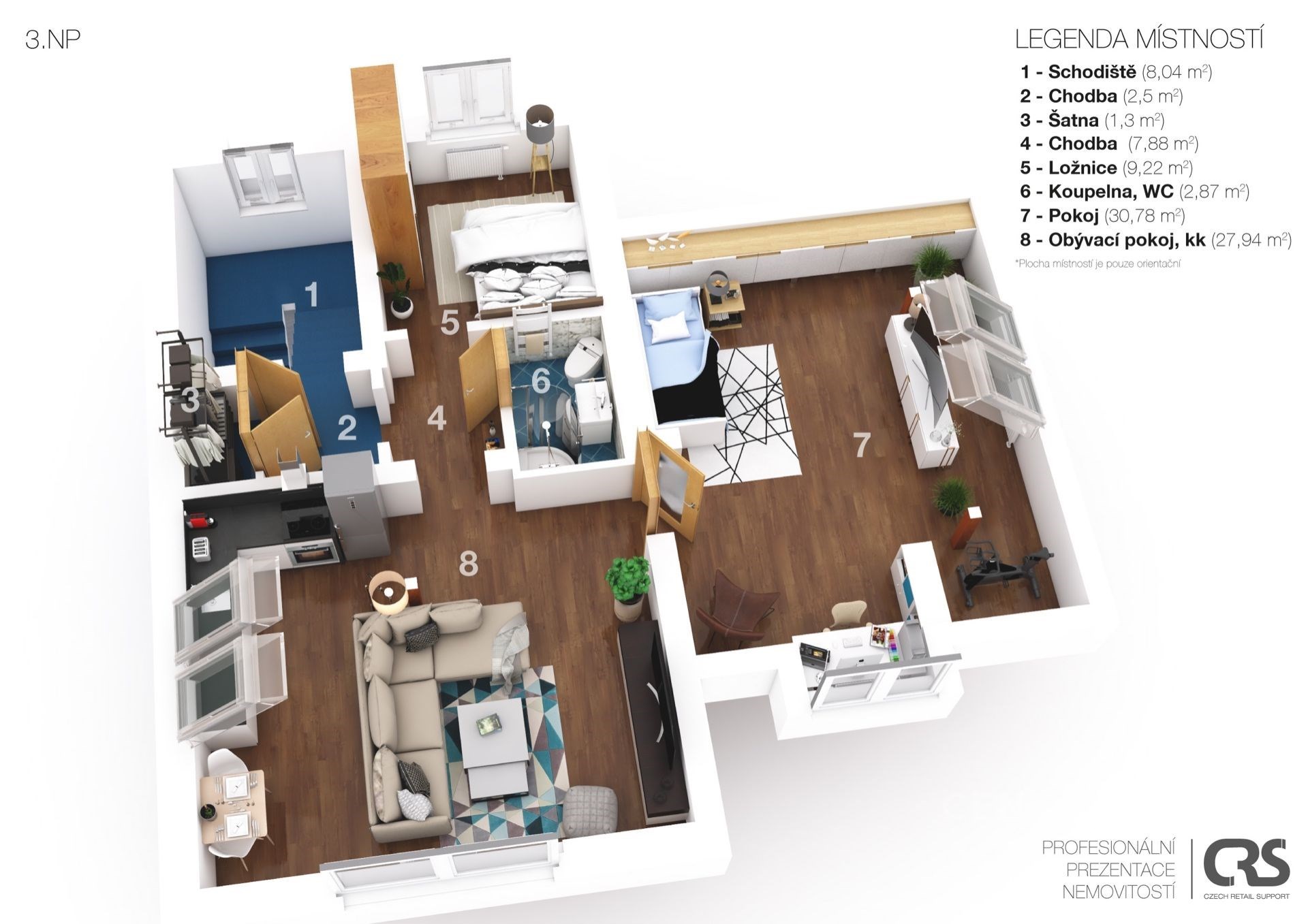 Podkroví: byt 3+kk, reko 2020 – všechny byty jsou dlouhodobě pronajaty, výborná platební morálka