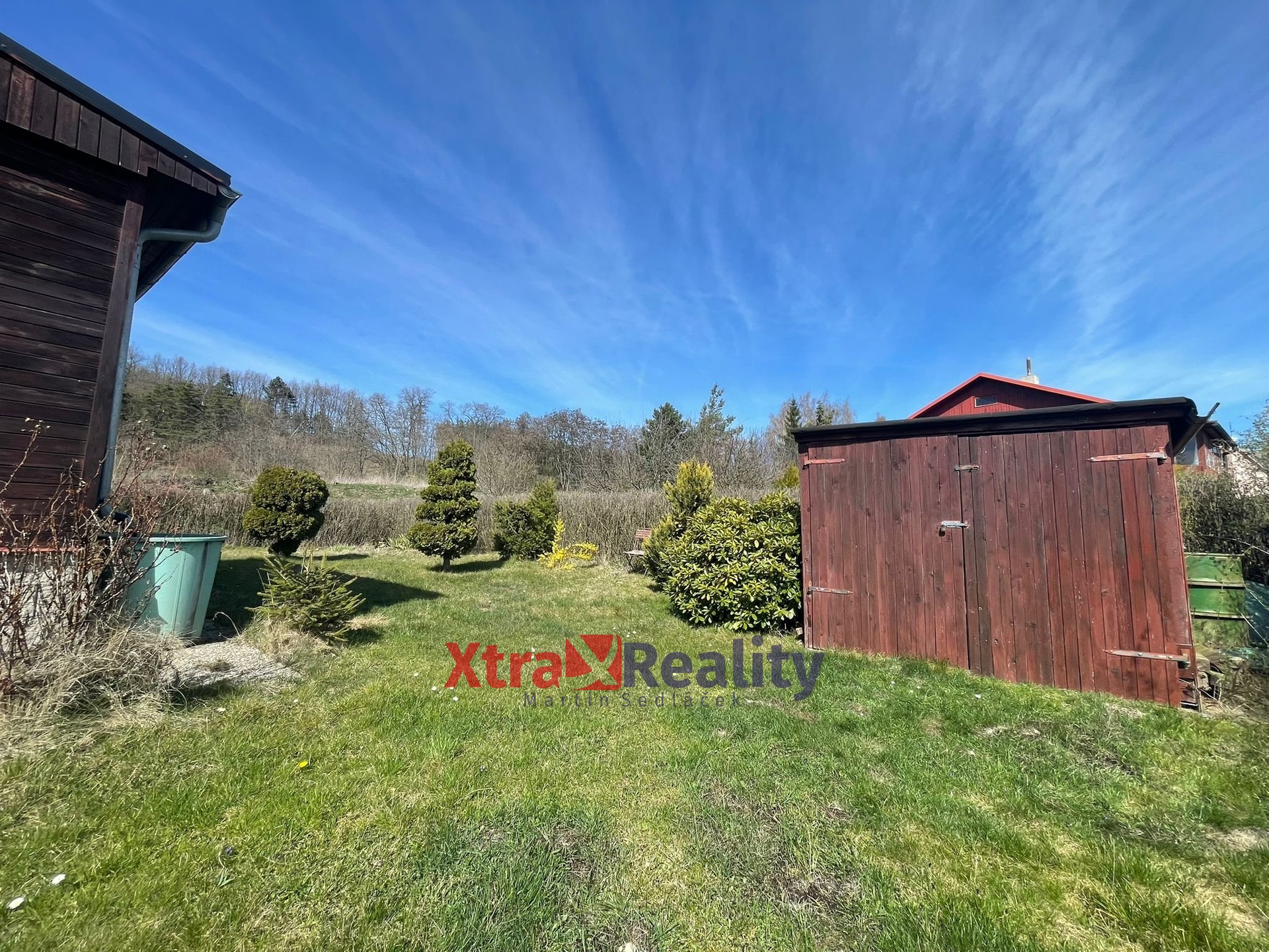 Na pozemku se nachází několik vzrostlejších stromů (thůje, rododendrony) a kůlna na zahradní techniku, která je součástí prodeje.