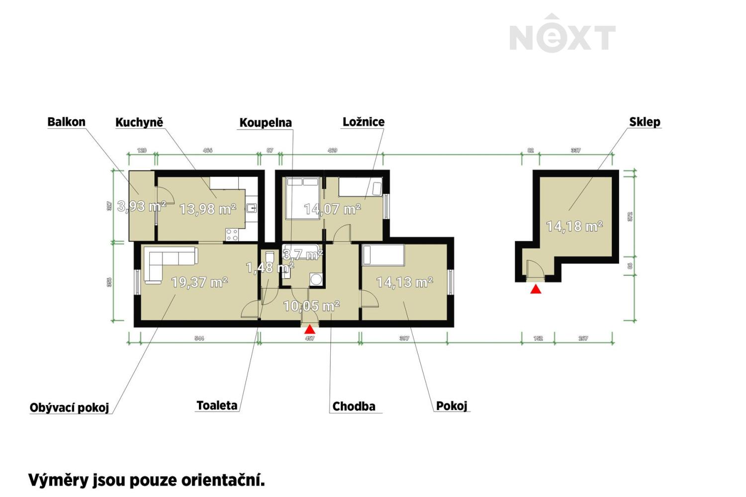 K bytu náleží balkon vhodný pro posezení a nadstandardně velký sklep (14,16 m²), který poskytuje dostatek úložného prostoru například pro kola, sportovní vybavení či sezónní věci.